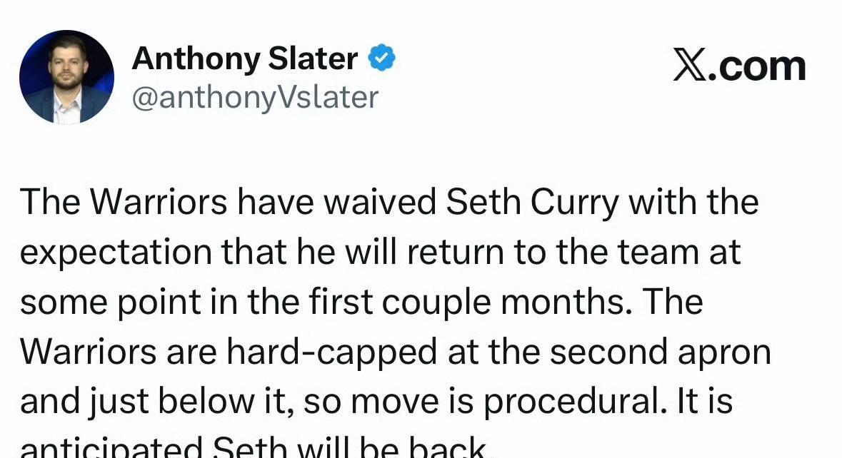勇士裁掉赛斯-库里 勇士记者Anthony Slater:预赛斯-库里将在未来一两个月内重返球队。