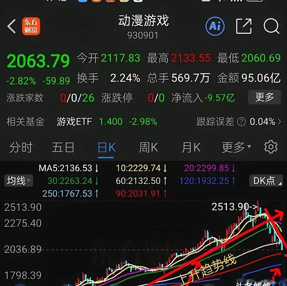 3,动漫游戏,日线走势如下图2所示,动漫游戏前期涨幅比较大,突破2500点后下跌回落,到目前为止,已经跌破了上升趋势线,沿着5日线下跌了10天,跌幅22%,理想一点在90日线附近止跌企稳,但是也有回踩半年线可能,大约6%空间,但愿不会发生。
