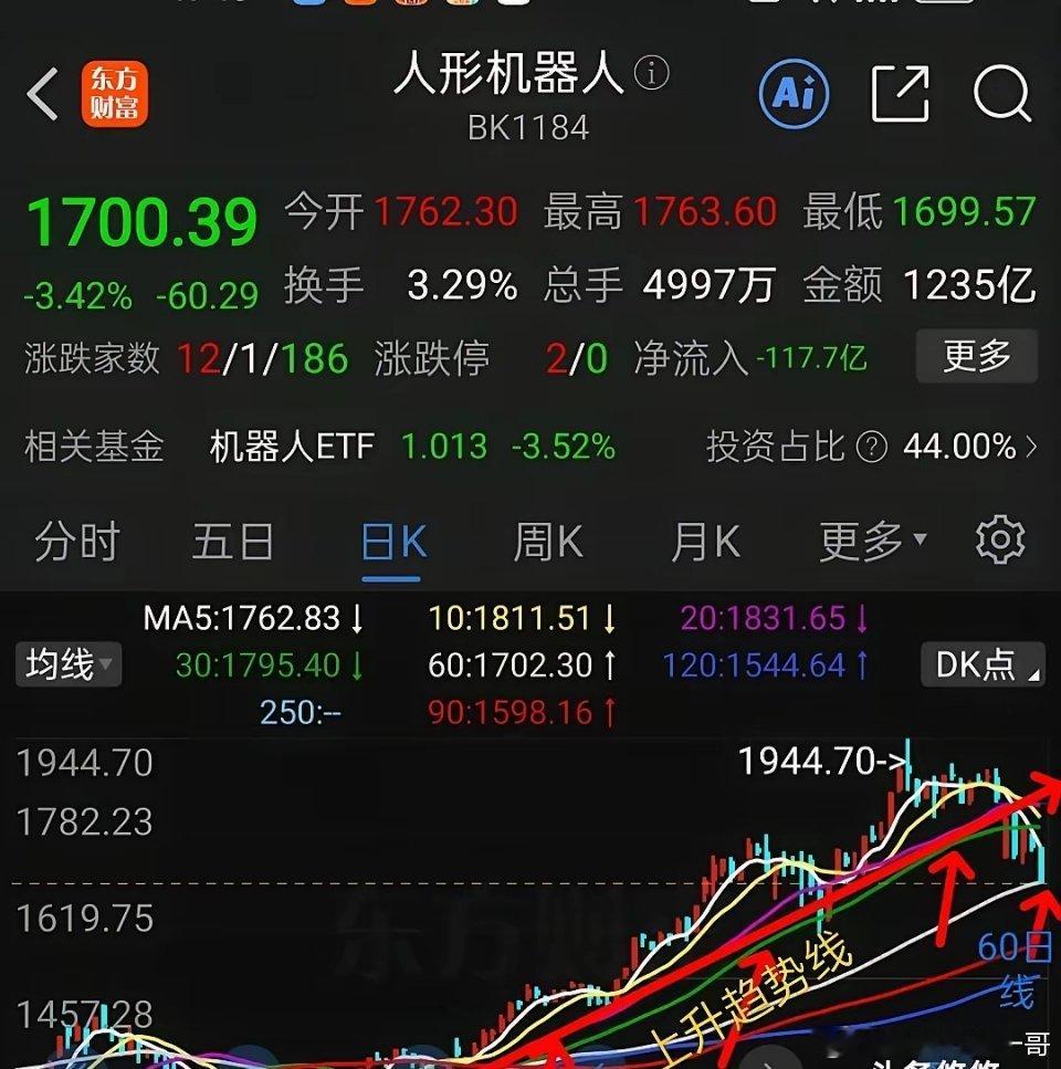 4,人形机器人,日线走势如下图所示,不争气的家伙,9月份就没怎么涨,这几天下跌到很猛,上升趋势线已经跌破,目前刚刚击穿60日线支撑,就一天不算有效跌破,下周看60日线支撑力度,本人倾向在60日线止跌企稳,下周初跟随大盘反弹。再往下寻找支撑有点不人道啦。