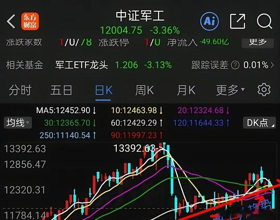 2,中证军工,日线走势如下图3所示,军工前期大涨,高点大幅回落,在60日线止跌企稳,并横盘筑底近1个月,刚看到希望,本周五大跌,击穿所有均线支撑,前期构筑的横盘筑底形态被破坏,目前止跌于90日线,不排除回踩下方半年线支撑,大约还有2.7%下跌空间。