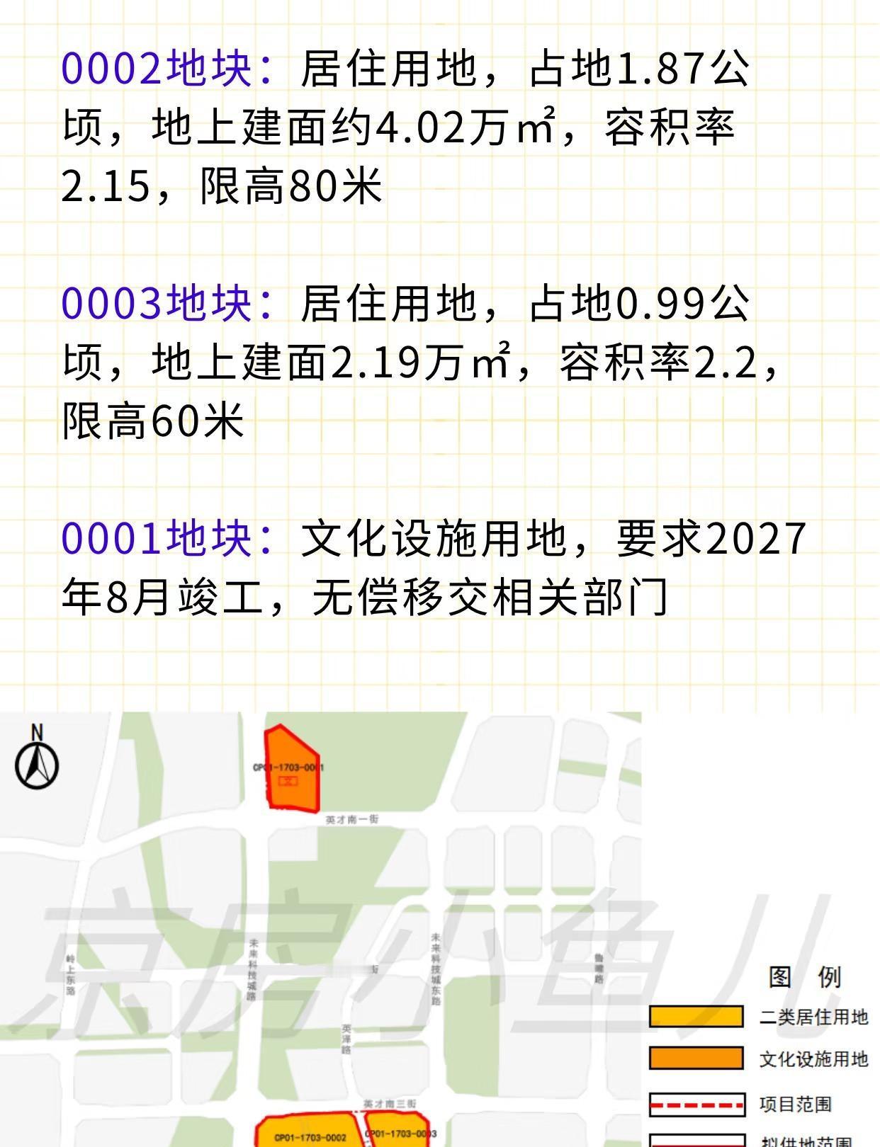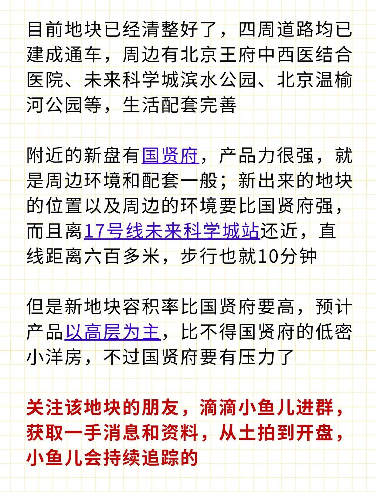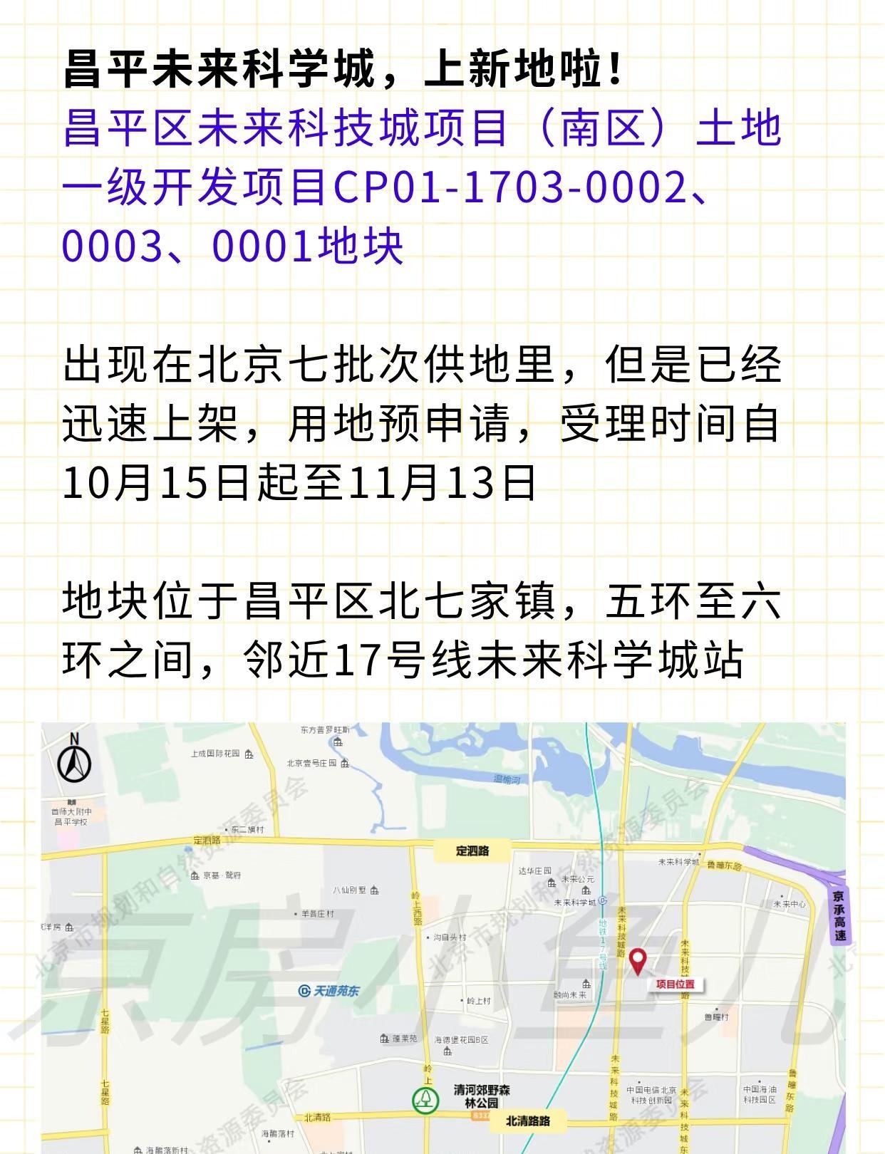 北七家上新地💥国贤府迎劲敌❗️❗️❗️ 昌平未来科学城,上新地啦‼️ 🔻昌平区未来科技城项目(南区)土地一级开发项目CP01-1703-0002、0003、0001地块 🔻出现在北京八批次供地里,但是已经迅速上架,用地预申请,受理时间自10月15日起至11月13日 🔻地块位于昌平区北七家镇,五环至六环之间,邻近17号线未来科学城站 ✅0002地块:居住用地,占地1.87公顷,地上建面约4.02万㎡,容积率2.15,限高80米 ✅0003地块:居住用地,占地0.99公顷,地上建面2.19万㎡,容积率2.2,限高60米 ✅0001地块:文化设施用地,要求2027年8月竣工,无偿移交相关部门 🔹目前地块已经清整好了,四周道路均已建成通车,周边有北京王府中西医结合医院、未来科学城滨水公园、北京温榆河公园等,生活配套完善 🔹附近的新盘有国贤府,产品力很强,就是周边环境和配套一般;新出来的地块的位置以及周边的环境要比国贤府强,而且离17号线