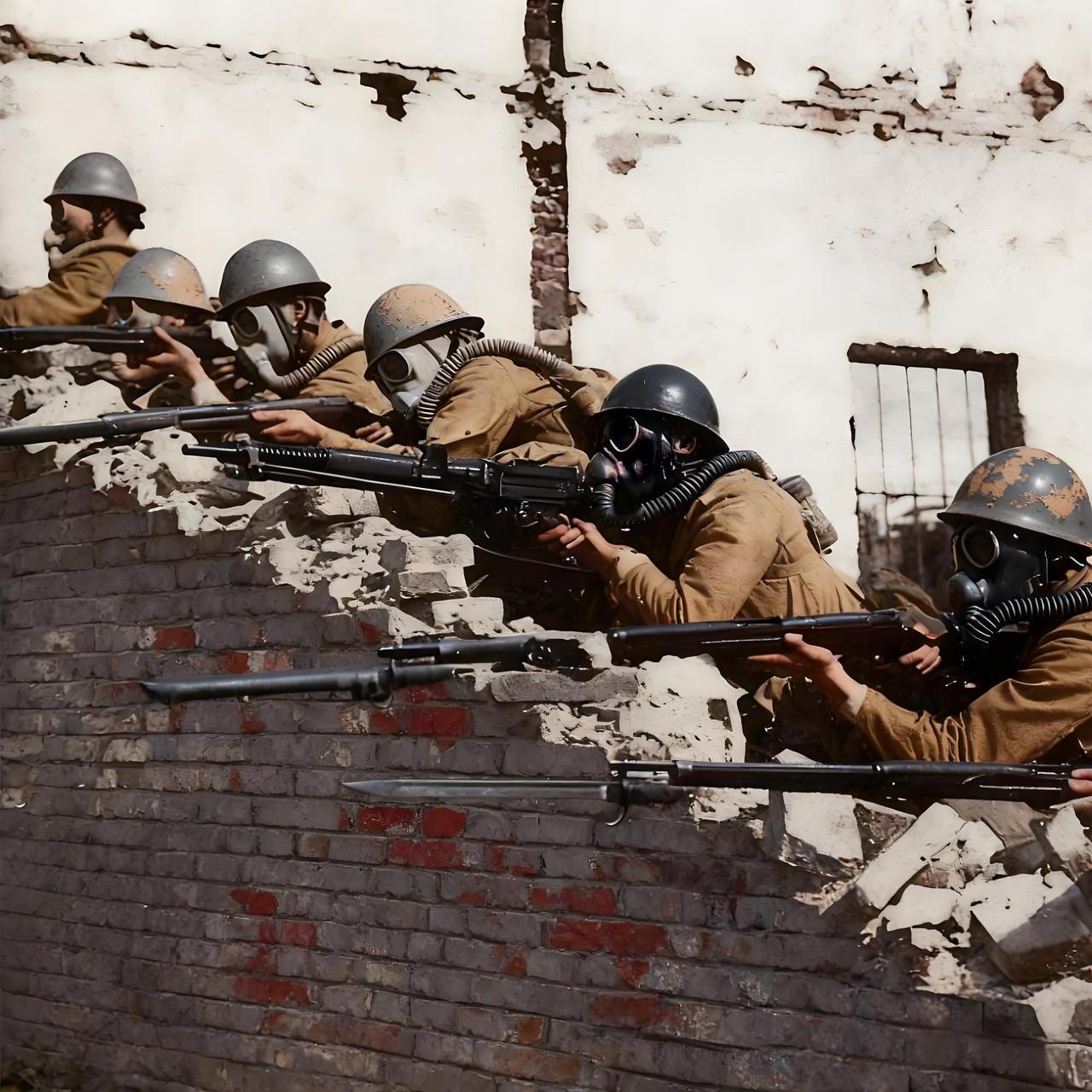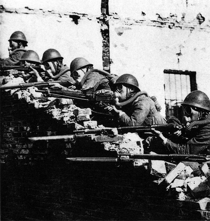 淞沪会战中,几名日军施放毒气后,戴着笨重的防毒面具,趴在残破的砖瓦废墟后,手持步枪、机枪,神情紧张地瞄准前方 淞沪会战期间,日军公然违反国际公约,多次施放毒气攻击中国军队,暴露了其侵略的残暴本质。