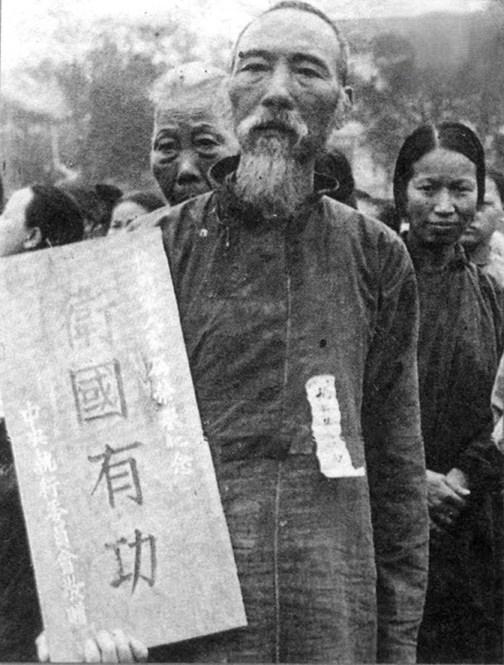 这张照片定格了20世纪40年代抗战有功人员家属的荣光时刻。画面中,一位留着长须的老人身着朴素长衫,神情庄重地手持一块“卫国有功”纪念碑,该碑由国民党中央执行委员会颁授。老人身旁还有其他民众,他们的神情或肃穆或关切,共同构成了抗战年代的鲜活切片。