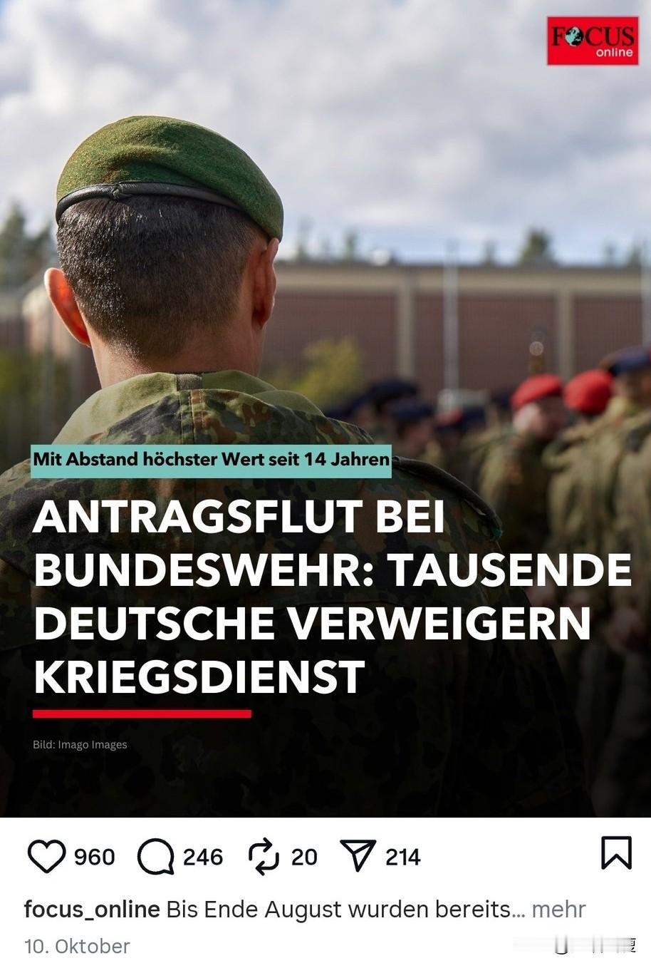 【越来越多的德国年轻人自愿加入军队】 啊哈,德国准备强制入伍18岁起的适龄男性,同时德国主流媒体已经开始改变说辞,尝试说服德国年轻人参军。 与此同时,一些德国媒体还明显没跟上节奏,还在如实报道德国年轻人的想法:能逃就逃掉。