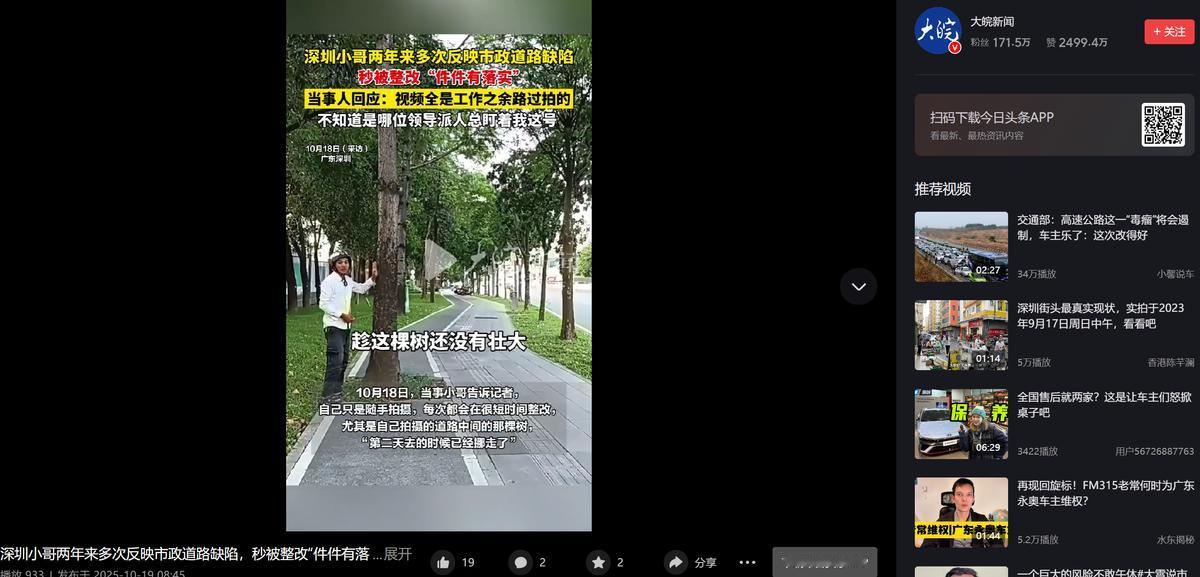 深圳一小伙,近两年来,休息期间便会在道路和人行道上找问题,一旦发现路面存在缺陷,男子便会拍视频发到网上向市政反映情况,结果一个反应一个准,过不了几天甚至第二天,这些道路缺陷都会被及时修复整改。起初不少网友也以为是小伙自己修的路,甚至称其为“道路缺陷拯救者”,但小伙却回应称,真不是他自己修复的这些道路问题,而是当地市政府整改及时,件件落实下来的。 这事儿说起来还挺有意思的,小伙这两年一到休息时间就不怎么宅家,总爱去家附近的道路、人行道上转悠,不是闲得慌是专门找路面上的问题,比如哪儿有坑洼、地砖翘了,或者路中间有凸起绊脚,甚至有时候路边的树长得太靠里,影响行人走路、车辆通行,他看着不顺眼,就掏出手机拍段视频,随手发在网上,想跟市政反映下情况。 他发的时候也没特意 @什么官方账号,就是觉得 “有问题提出来,能解决最好,解决不了也没啥”,没抱多大期望。 可没想到这反馈的效果远超他想象,有一回他拍了棵挡路的树,觉得影响交通又不安全,视频发出去第二天再路过,那树居然已经移走了,原本坑坑洼洼的路面还重新铺得平平整整,还有一次他发现某条路中间有个七厘米高的凸起,走路的人稍不注意就容易崴脚,开车经过也得减速,他把这情况拍下来发上网,没过几天再去看凸起的地方就被修平了。 这两年他反映的路面问题,几乎没落下过,件件都有回音,快的时候隔天就解决,慢的也没拖过多久,一开始网友刷到他发的视频,看他今天拍个路面缺陷,过两天再拍同一个地方就修好了,还以为是他自己默默去修的,纷纷夸他 “低调的扫地僧”“为大家办实事”。 小伙看到这些评论都懵了,赶紧发视频澄清:“真不是我修的,我就是个拍视频反映问题的,真正做事的是咱们市政府,他们整改得又快又好,我也不知道具体是哪个部门处理的,反正反映完很快就有结果。” 其实换作咱们平时,遇到路面有问题,比如井盖松了、地砖坏了,大多时候要么不知道该找哪个部门反映,要么就是觉得 “就算说了也白说,没人管”,久而久之就懒得 “多管闲事” 了。 以前想通过传统渠道反馈,比如填个表、打个电话,常常就像往大海里扔石头没个下文,可在这位深圳小伙这儿,完全是另一番景象,不用走复杂流程,随手拍个视频发上网,问题就能被精准捕捉到,还能高效解决。 小伙自己都说,有时候他都忍不住猜,是不是自己的社交账号被哪个领导 “重点关照” 了,当然这也就是句玩笑话。但这背后其实能看出来,现在政府不是再像以前那样被动等投诉,而是主动在网络上找民意,老百姓随口提的一个小问题他们也当回事儿。 网友们都羡慕地说这是 “深圳速度”,但其实比速度更难得的是 “民生温度”,在城市管理者眼里,老百姓走路会不会崴脚、开车会不会颠簸,这些看似不起眼的小事,其实都是关乎大家日常的大事。 这种像邻里聊天似的反馈方式,居然能这么管用,其实是城市治理能力在进步,它打破了咱们以前 “说了也白说” 的无奈,慢慢建立起一种新的信任,市民觉得 “我提的问题有人听、有人管”,政府也能及时知道大家的需求。 当这种默契越来越多,比修好多少条路都珍贵,有人说为啥发达地区能越发展越好,其实就藏在这些细节里,愿意听老百姓的声音,还能快速改正问题。 (信息来源:大皖新闻——深圳小哥两年来多次反映市政道路缺陷,秒被整改“件件有落实”, 当事人回应:视频全是工作之余路过拍的,不知道是哪位领导派人总盯着我这号)