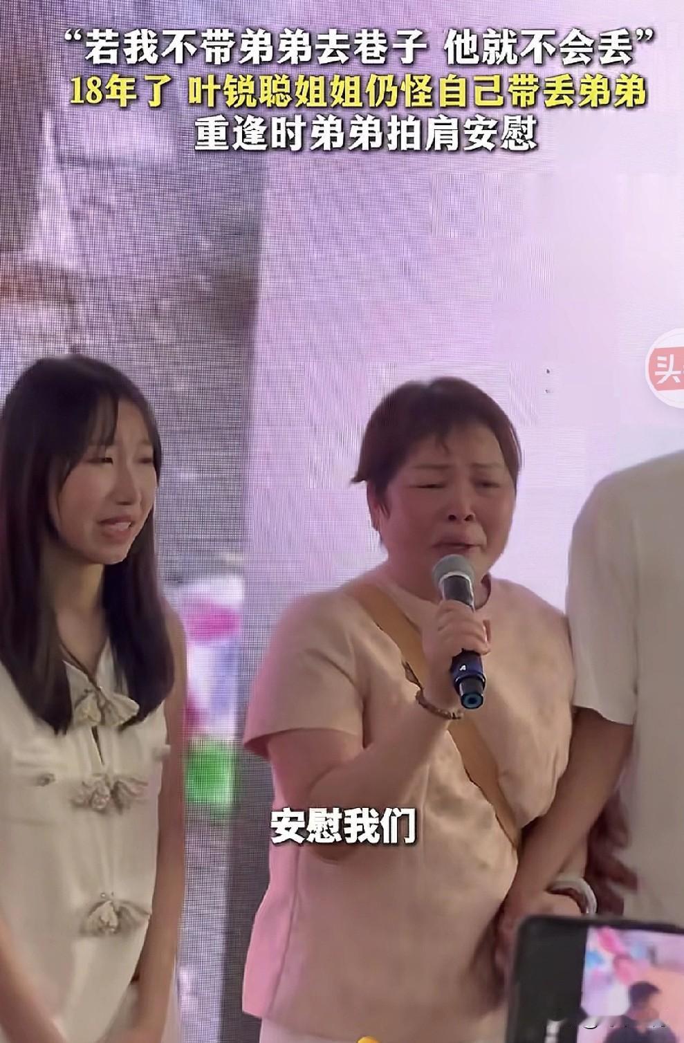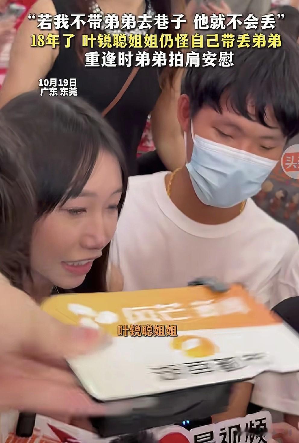 叶锐聪的姐姐终于放过了自己,释怀了。 九个月被抢走的叶锐聪回来了。 这场18年的等待,在今天落幕了。 这个姐姐亲自经历了弟弟的被抢,弟弟是在她的手里被坏人抢走的。 这个姐姐每当想起弟弟被抢时的情形,她就夜不能寐,她常常在想,大人不让他们小孩子到小巷子里玩。如果是自己听妈妈的话,不带弟弟到小巷子里玩,是不是弟弟就不会被坏人抢走呢? 妈妈并不怪姐姐,还总安慰她。妈妈害怕姐姐太懂事,太过于责怪自己。 可是姐姐就是太懂事了,在姐姐当年考大学填志愿时,她的第一志愿就想填上警察专业,姐姐想通过做警察,能够更方便找弟弟。妈妈制止了她,妈妈不想让姐姐的人生如此沉重。 姐姐现在还没有男朋友,我们看到姐姐的长相瘦弱漂亮,惹人怜爱。她曾对妈妈说,她不要找男朋友,她也不要成立家庭,她要赚钱找弟弟。 18年后,弟弟有消息了,家里要办答认亲谢宴了。姐姐说服父母亲身一个人,远赴四川弟弟的学校,把弟弟接回东莞。 姐姐说,初见弟弟时又紧张又激动,紧张是因为第一次见弟弟心里没底,害怕说错话,弟弟心里产生隔阂;激动的是姐姐担心的这一切都没有发生,弟弟非常接纳这个姐姐,还知道关心姐姐。 多好啊,从今以后,姐弟相处的时间有都是。