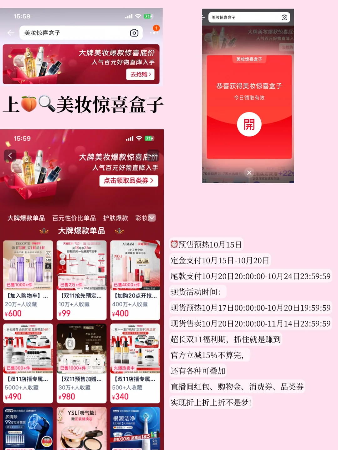现货售卖10月20日20:00:00-11月14日23:59:59 超长双11福利期,抓住就是赚到 官方立减15%不算完,还有各种可叠加直播间红包、购物金、消费券、品类券 实现折上折上折不是梦!