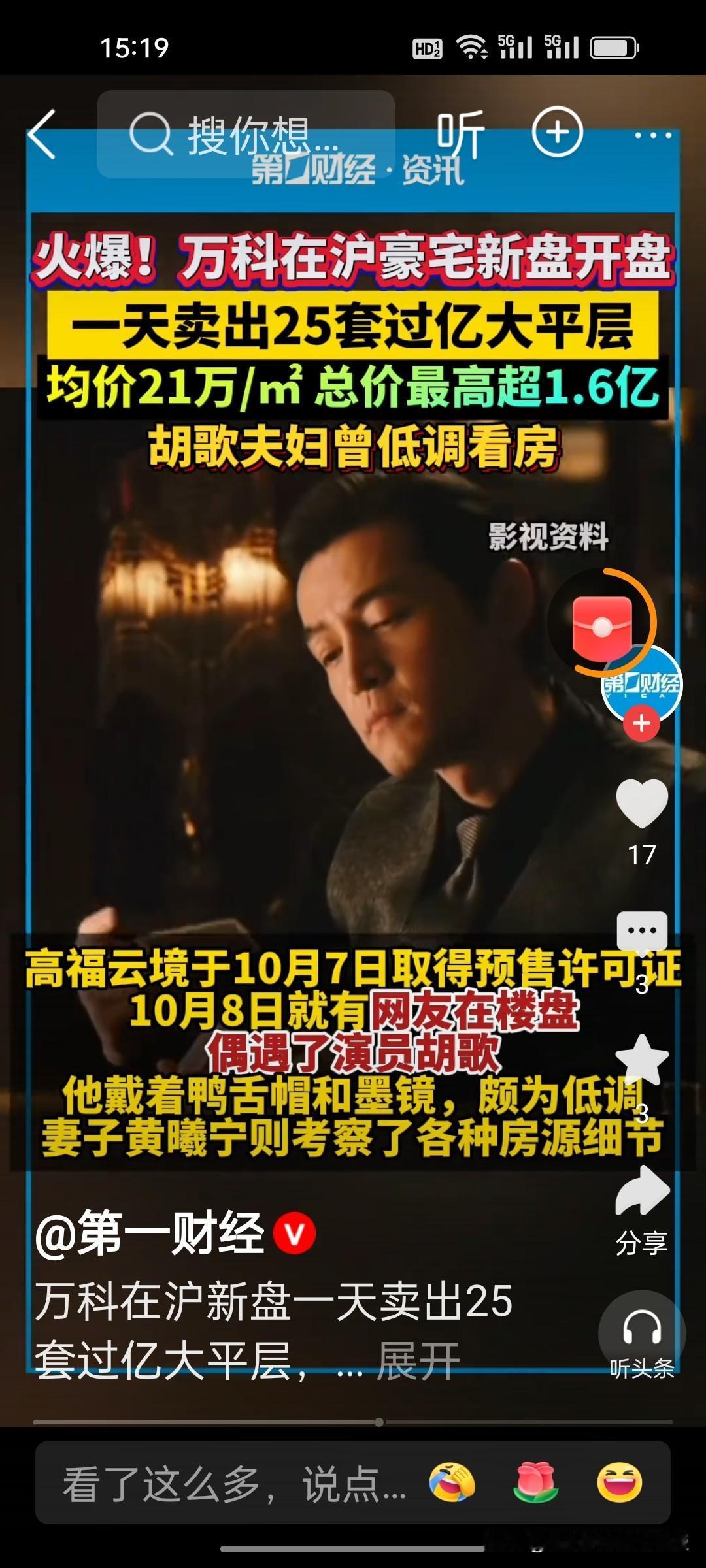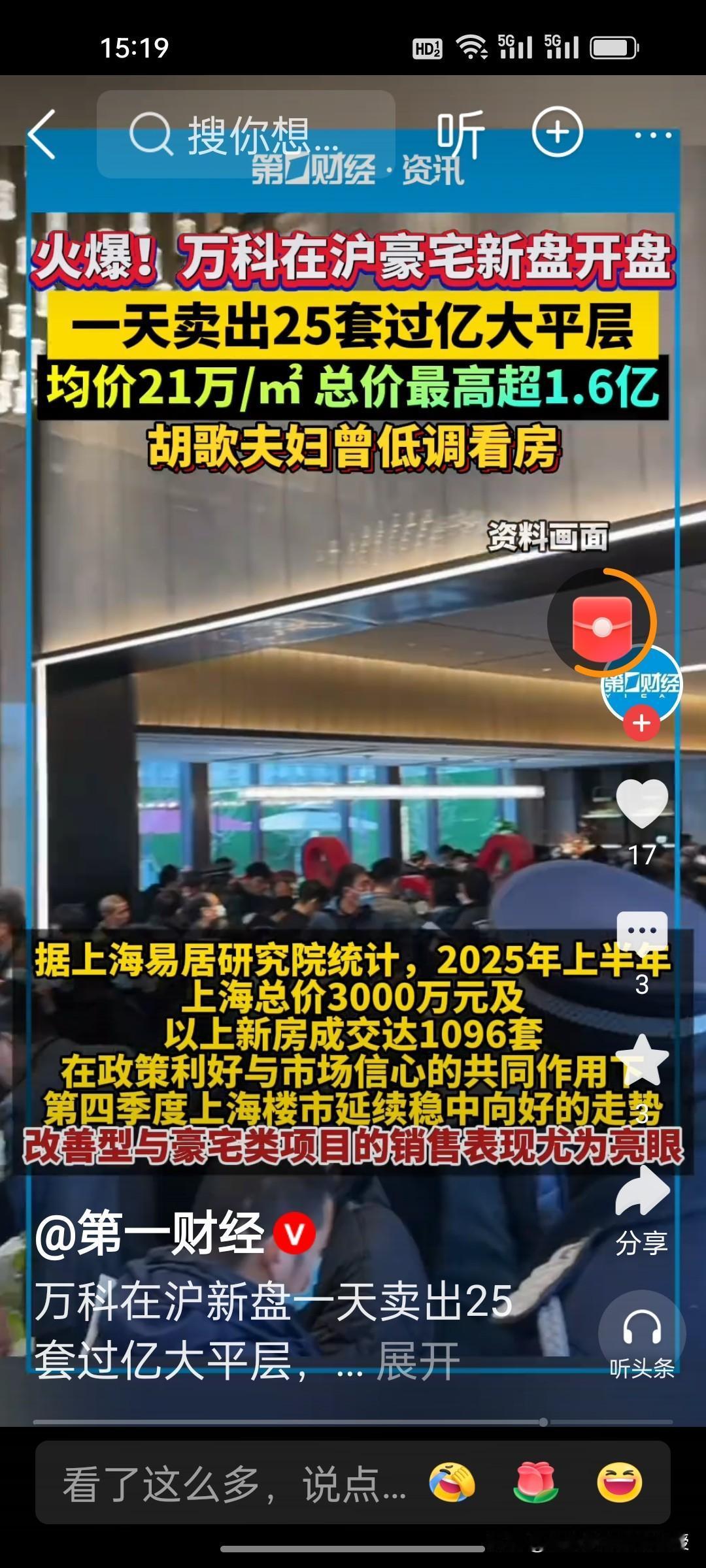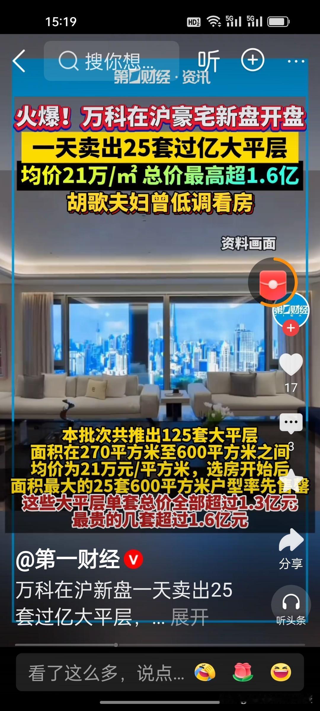 尽管万科最近处于风口浪尖,但是丝毫不影响万科上海黄浦区大豪宅项目销售!近期上海核心地段的豪宅真的不愁卖,万科大平层“高福云境”25套600平超过1.3亿的房子已经卖完了。胡歌夫妇还成了第一批看此房子的客户。不知道他们最后有没有买成功。 现在楼市是冰火两重天,四五线小城市和一线大城市的核心地段房产销售情况大不相同,在没有更多理财产品适合当下财富保值怎么办?富豪们仍将一线核心地段的顶级豪宅视作“压舱石”般的优质资产,果断出手布局。