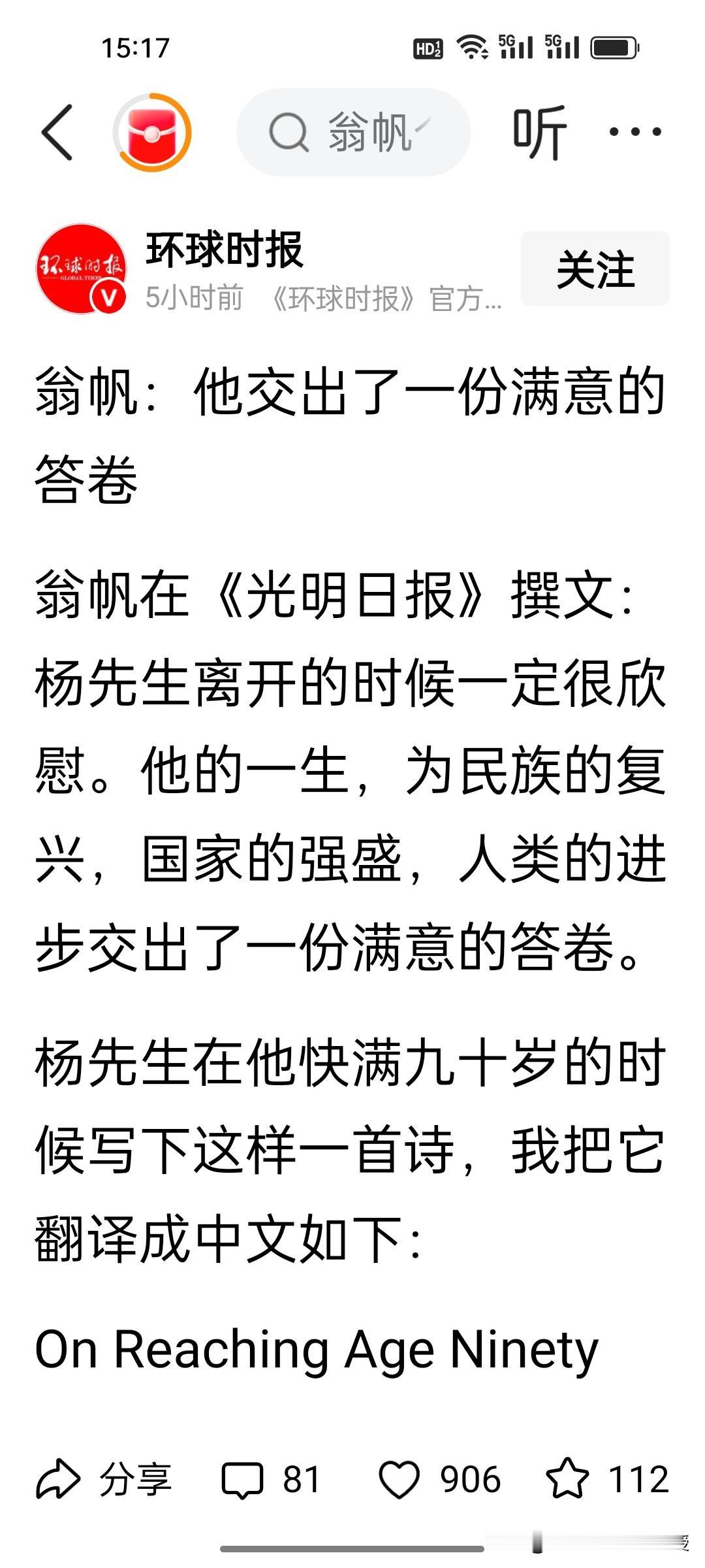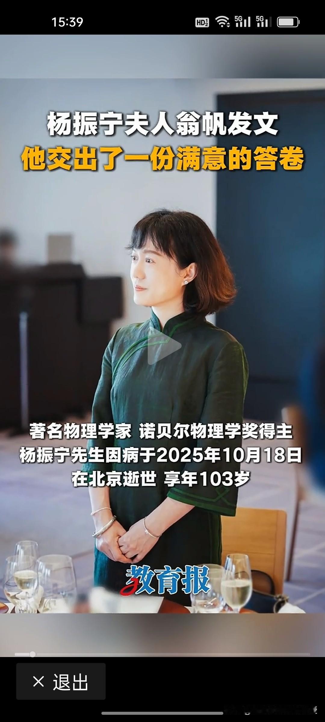 翁帆在《光明日报》的撰文,字里行间满是感恩与崇敬,很多人认为是翁帆用二十多年的青春陪伴杨振宁的晚年生活,可是翁帆的感受却不同,她反而感恩杨先生多年的陪伴,视其为人生幸事,她还崇敬杨振宁为人类进步交出满意答卷的一生。同时,翁帆相信杨先生如星辰般闪耀,其伟大的精神永远给予人们前进的力量。 翁帆对杨先生的情感,已经超越了世俗,这是岁月沉淀下的真挚感恩,是对其一生为人类奉献的深深崇敬。那朴实的字里行间,没有华丽辞藻,却满是对相伴时光的珍视,这份情感质朴而厚重,动人至深。 人民日报忆杨振宁:宁拙毋巧 宁朴毋华