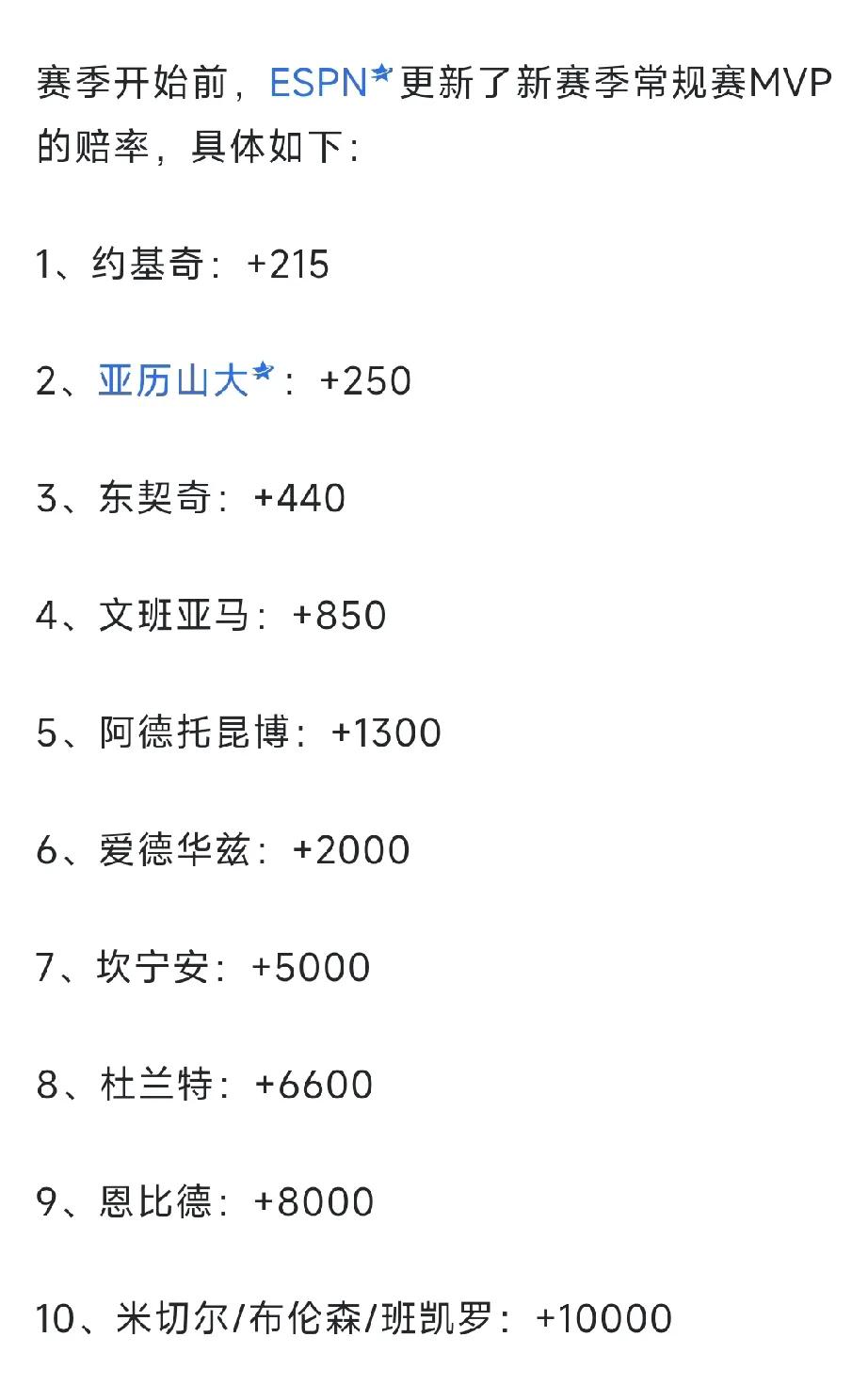 ESPN新赛季MVP赔率,湖人球迷不要伤心哈,虽然东契奇高居第三,但说实话,下赛季的MVP大概率还是约基奇和亚历山大两个人的竞争,其实东契奇可以说一点机会都没有,首先战绩上面肯定不如掘金和雷霆,其次东77的个人数据肯定也没有约基奇和亚历山大那么出彩。所以那些认为东契奇新赛季很有可能拿下个人职业生涯第一座MVP的球迷还是醒醒吧!