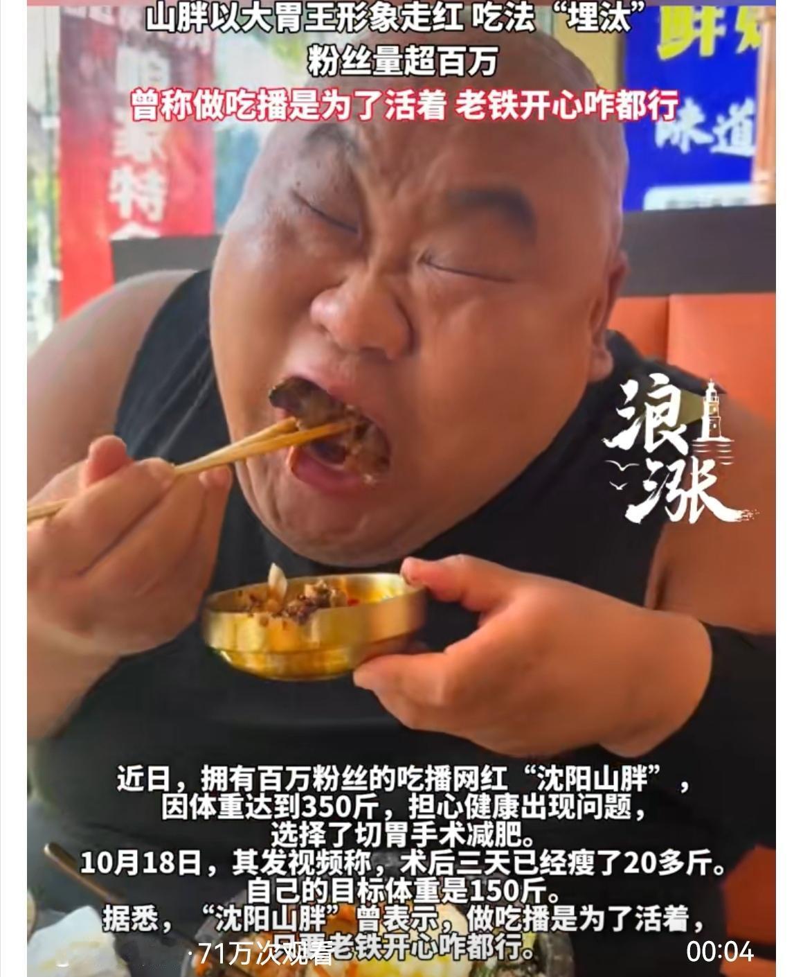 要说吃播界的大咖,“沈阳山胖”绝对榜上有名。这个拥有超过百万粉丝的网红,以豪爽的性格和惊人食量圈粉无数。但最近,他却因为体重达到350斤,正式决定走进手术室,进行切胃手术来减肥。这一举动瞬间在网络上炸开了锅,也引发了粉丝们对他健康状况的关注。 在10月18日发布的新视频中,“沈阳山胖”坦言自己已经在术后三天迅速减掉了20多斤。他还定下了一个雄心勃勃的目标——希望最终将体重控制在150斤,这几乎是直接“腰斩”原来的体重。对于吃播初衷,他也曾朴实地表示:“做吃播是为了活着,只要老铁开心咋都行。”这句话也让不少网友为他的坦率点赞。 事实上,随着吃播行业的发展,网红们的健康问题一直备受关注。“沈阳山胖”这次选择切胃减肥,不仅是在为自己负责,也是给同行敲响了健康警钟。数据显示,过度饮食导致的肥胖以及相关疾病不容小觑,如何平衡事业与健康成为每个吃播博主必须面对的话题。 目前,“沈阳山胖”恢复情况不错,粉丝也纷纷留言支持,希望他能早日实现自己的减肥目标,把健康生活和开心吃喝都找回来。毕竟,无论是幕前还是幕后,好身体才是最大的流量密码!