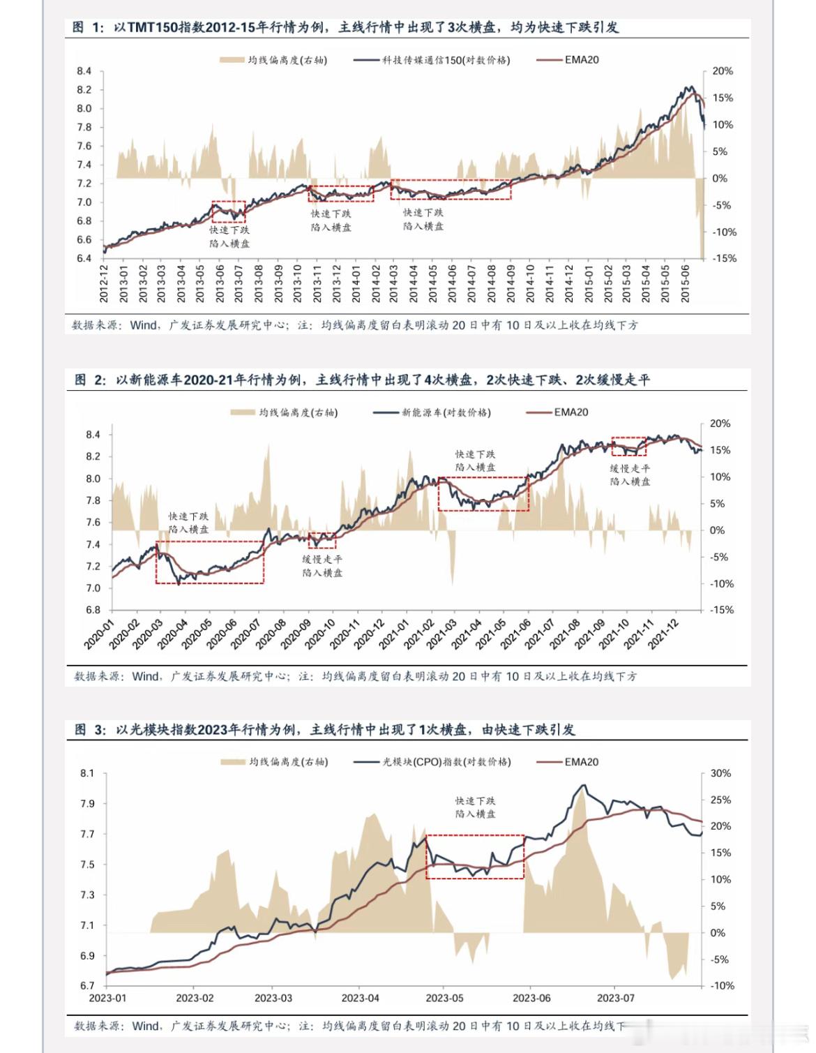 价值投资日志[超话] 复盘历史上的主线行情,往往会经历“趋势-横盘-趋势延续”的过程均线是趋势的生命线,均线上方的趋势往往走势健康,若行情短期大幅跌破均线、或在均线上下拉锯过久,大概率会导致行情陷入横盘。但横盘也不意味着主线行情终结,历史上主线行情大多存在横盘后继续创新高的情形,从后验的视角看,“横盘”也变成“上涨中继”。典型如2012-15年的TMT150、2020-21年的新能源车、2023年的光模块,主线行情中均出现横盘阶段,且多数不止出现1次。
