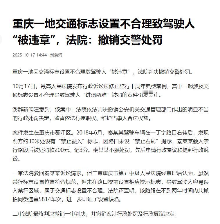 重庆綦江,一男子开车行驶至某丁字路口向右转行驶了30米,却发现前方有“禁止驶入”的标志。男子无奈继续驶入,结果被罚了款、记了分。男子认为沿路没有提醒标志,且禁止驶入标志设置的不合理,于是提起行政诉讼,谁知一审和二审法院却给出了不同判决,而在庭审前,男子发现同一路段已出现过类似罚款5814次。(来源:新黄河,重庆市第五中级人民法院) 事发当天,男子秦某开车外出吃饭时,经过一个丁字路口。秦某观察了一下前方路况,左侧是某小学路段,右侧是口腔医院,前方和右侧都没有“禁止右转”的标志。 在看到前面一辆车右转后,秦某也跟着右转。可万万没想到,秦某才向右转后行驶了30米,道路左侧突然冒出个“禁止驶入”的交通标志,地上还画着反向的单行标志。 这下可把秦某给难住了,进也不是退也不是,最后还是选择继续向前行驶。 半个多月后,秦某收到了一条处罚信息,称其在丁字路口处逆向行驶,违反了《道路交通安全法》,所以要罚款200元、记3分。 秦某觉得实在太冤了,明明路口没提示不能右转,怎么现在就违法了? 为此,秦某去申请了行政复议,可复议机关却维持了原处罚决定。 秦某并未服输,他申请了政府信息公开,结果发现近2年,涉事路段共有5814次违章。 秦某气坏了,这难道是钓鱼执法?为了罚款而罚?于是他起诉到法院,要求撤销行政处罚决定。 对此,交警队辩称,涉事路段并非全线禁行,在该直线路段开始后10多米处,才开始禁行,这是为了方便进入医院旁边的地下车库。 此外,在地库的出入口的路边已经设置了禁行标志,且在禁行路面有单向行驶的箭头标志,只要行驶到该路段,一眼就能看清楚。 因此,交警队认为秦某的说法不能成立,对秦某的处罚没有问题。 一审法院经审理后认为: 《道路交通标志和标线第2部分:道路交通标志》第3.2.2规定,交通标志一般情况设置在道路行进方向右侧或车行道上方;也可根据具体情况设置在左侧,或左右两侧同时设置。 本案中,涉事路段是支路,并非主干道,且道路的右侧为停车路段,所以禁止标志不宜设置在车辆行进方向的右侧和行车道上方。 而由于道路条件有限,所以交警队在地下车库的出口处的左侧,设置了一个禁行标志,以提醒车辆不要驶入单行车道。 此外,秦某的前一辆车向右转后,是驶入地下车库的,并没有违反规定,而秦某是继续向前行驶,逆向驶入了单行车道,所以秦某的确是违法了。 因此,一审法院判决驳回了秦某的诉请。 秦某不服一审判决,提起了上诉,没想到迎来了转机。 二审法院经审理后认为: 按照《道路交通标志和标线第2部分:道路交通标志》的规定,道路左侧和右侧设置禁行标志,并没有任何问题。 因此,秦某以左侧设置禁行标志违反观察习惯为由,认为交通标志设置不合理,本院不予支持。 按照秦某的陈述,他是紧跟着前一辆车向右转行驶的,而由于贴得太近,秦某并未看到道路左侧的禁行继续向前行驶的标志。 对于这个说法,法院认为具有一定的合理性。虽然交通信号标志设置在左侧是合法的,但并不一定符合驾驶员的关注习惯。 根据秦某提交的政府公开信息,事发路段已经抓拍同一类型的违章5814次。 这也说明了禁行标志设置在左侧,并不符合驾驶员的观察习惯。交警队应当将相关标志设置在右转的路口处或者道路右侧,并进行详细说明。 二审法院认为,行政法规的执行不能完全照搬条文,还需要考虑实际的情况。既然交警队设置的禁行标志存在不合理之处,那就应当予以修正。 最终,二审法院支持了秦某的诉请,判决撤销了一审的判决、行政复议决定以及交警队作出的行政处罚决定。案件受理费100元,由交警队承担。 在判决生效后,法院向交警部门提出了司法建议,涉事路段的交通信号标志也得到了优化。 对于这起案例,您怎么看?欢迎留言交流。