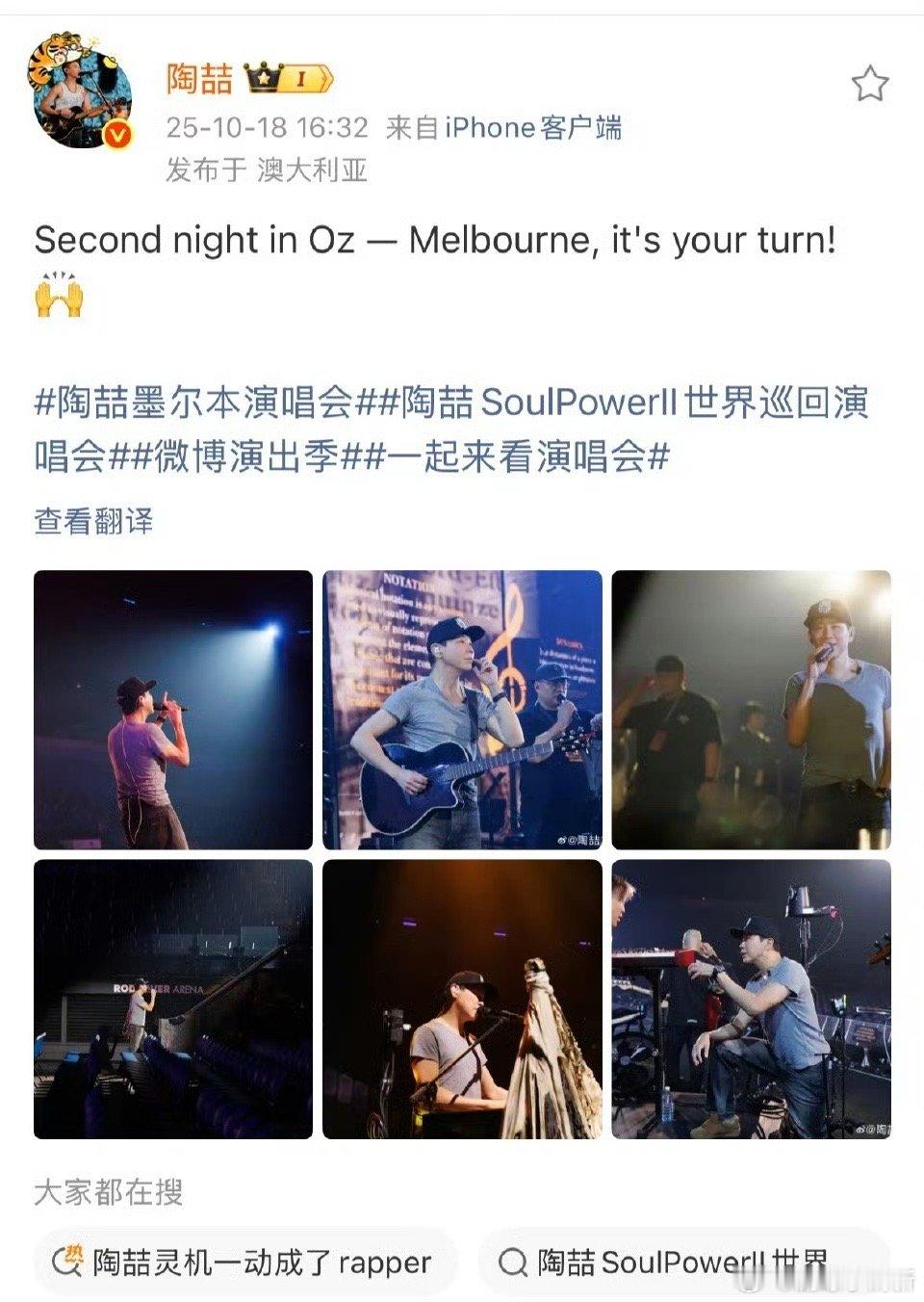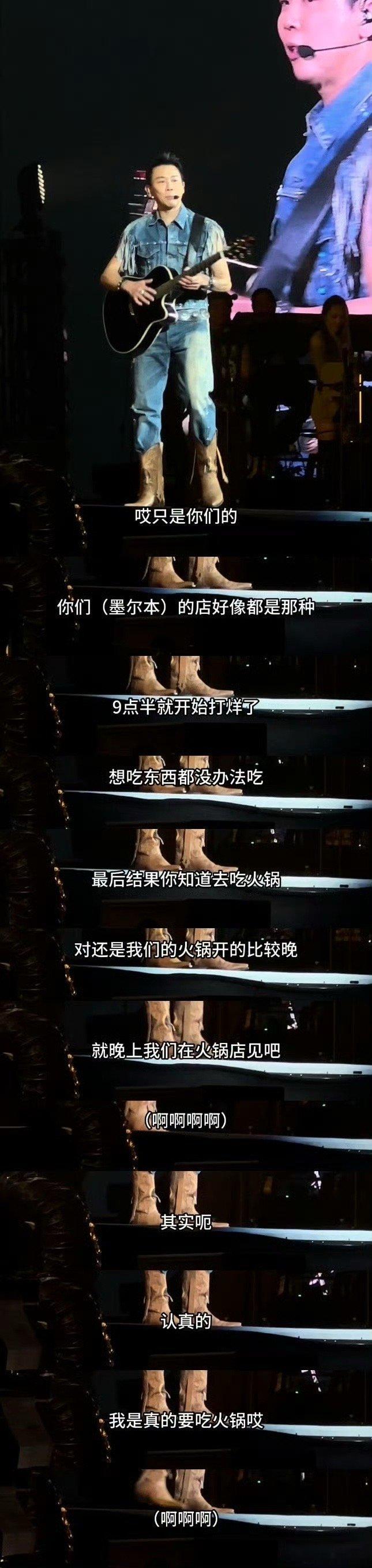 陶喆入乡随俗成这样 笑不活了!陶喆墨尔本演唱会上吐槽当地九点半后餐厅多打烊,只剩火锅店可吃,还邀约观众散场后一起吃火锅,接地气的样子太圈粉。