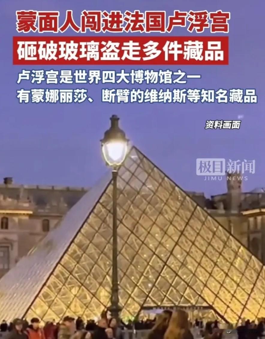 都什么年代了,还能出现这种事,真够匪夷所思的,有网友评价:2025,还有这么科幻。 卢浮宫,世界上最古老、最大、最著名的博物馆之一,藏品数量40万件。 仅7分钟被抢走9件拿破仑时期珠宝,国家级博物馆出现这种事,难以置信啊。 好多人以为是拍电影呢,这又提供了很多素材啊。 不偷不是意大利,不抢不是法兰西,又偷又抢英吉利[捂脸],邦邦两枪是美帝。 这是电影照进现实《惊天魔盗团》了吗?