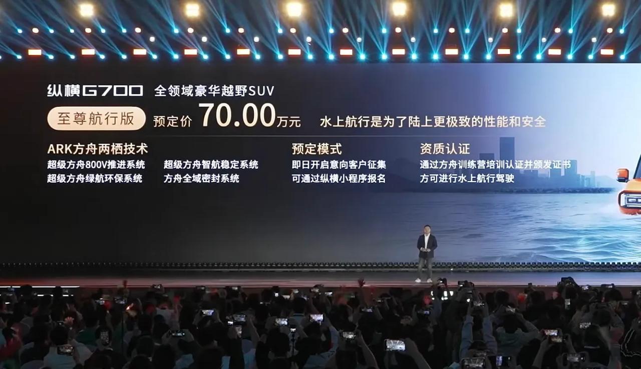 豪华硬派越野车纵横G700上市,四款车型置换补贴后售价30.49万-38.99万元。同时还有能在水中行驶的“至尊航行版”,预订价70万元。但是购车用户需要通过资质审核,参加培训考核方可购买。李学用特别强调,车主不要随意将车开到江河中。此次发布会用时将近三小时,奇瑞将此次活动作为2025全球创新大会的重头戏,异常重视。