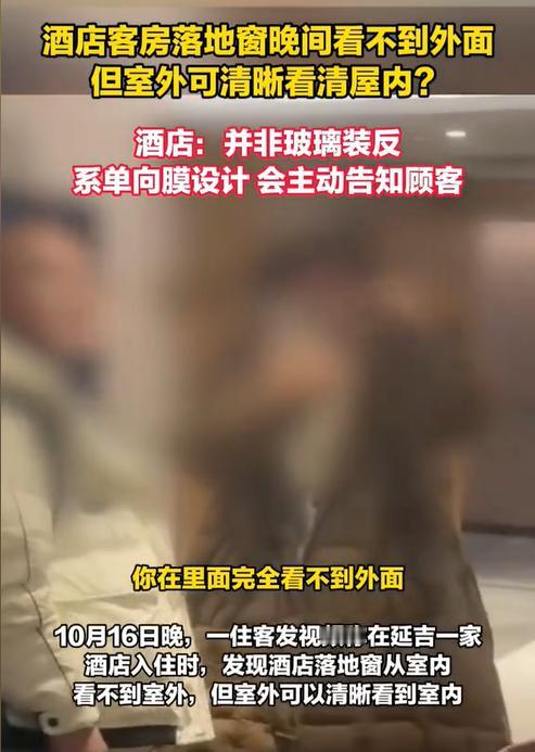 吉林延吉,一女子入住酒店后,意外发现房间中的落地窗有问题,完全看不到外面的情况,可外面的人能清晰看到房间内的情况。女子向酒店工作人员讨说法,谁知酒店工作人员解释这是单向膜,哪里光线比较强,哪边就比较亮,这是新设计。(来源:三峡商报) 据悉,女子来延吉旅游时,入住了百货大楼西市场的一家连锁酒店。女子还挑选了一个夜景房,能通过房间内的落地窗欣赏外面的景色。 然而当女子进入房间打开灯时,却发现想通过落地窗看外面的景色就完全看不到。女子以为落地窗出了问题,虽然有点遗憾,但也不想再换房间了。 可是当女子收拾完东西,准备出门逛逛时,从外面走廊处居然能清晰地看到自己房间内的一切事物。女子立即拿出手机取证,随后进入房间查看,的确看不到外面的景色。 这下女子慌了,这样隐私不就全部暴露了吗?于是女子去找了酒店前台讨要说法。 酒店工作人员立即解释说,房间窗户都贴了单向膜,光线强弱决定哪边能看清。白天外面的光线强,外面就看不到房间内部。但晚上房间开灯后,里面就看不到外面的景色了。 工作人员还十分自豪地说这是内景式房间独有的设计,然而女子却十分气愤,这个设计简直就是反人类。 女子质问酒店工作人员,住客是否知道玻璃的问题,结果工作人员支支吾吾,没给出明确说法,这让女子更加不满。之后,女子将此事曝光了出来。 有网友表示,这样的酒店不敢住,万一有小情侣情不自禁要做点羞羞的事,那不等于是现场直播了? 还有网友表示,酒店居然不提前告知顾客具体情况,这严重侵犯了顾客的合法权益。 对于酒店的这个设计,的确是让人无法理解,更是无法接受。 酒店虽然是公用场所,但酒店的房间属于花钱的顾客的私人领地。既然如此,顾客就享有了隐私权。 《民法典》第1032条规定,自然人享有隐私权。隐私是自然人的私人生活安宁和不愿为他人知晓的私密空间、私密活动、私密信息。任何组织或者个人不得以刺探、侵扰、泄露、公开等方式侵害他人的隐私权。 因此,酒店的行为其实是变相地在侵害顾客的隐私权。 其次,酒店作为经营场所,在顾客入住酒店后,酒店应当尽到安全保障义务、告知义务等,以确保顾客的合法权益不受侵犯。 《民法典》第8条明确规定,消费者享有知悉其购买、使用的商品或者接受的服务的真实情况的权利。 但是女子入住酒店时,工作人员并未介绍房间的特色,反而是女子自己发现后,质问酒店时,酒店才告知了原委。 因此,酒店的行为已经侵害了女子的知情权。 在这种情况下,女子作为消费者,有权要求酒店承担相应的责任。如更换房型,或给予一定的补偿等。 最后,酒店为了吸引顾客推出特色主题房型是没有问题的,但一定要注意保护顾客的隐私以及安全,否则不仅达不到吸引顾客的目的,还会使得酒店的名誉一落千丈。 对于这家酒店的设计,您有什么看法?欢迎留言交流。