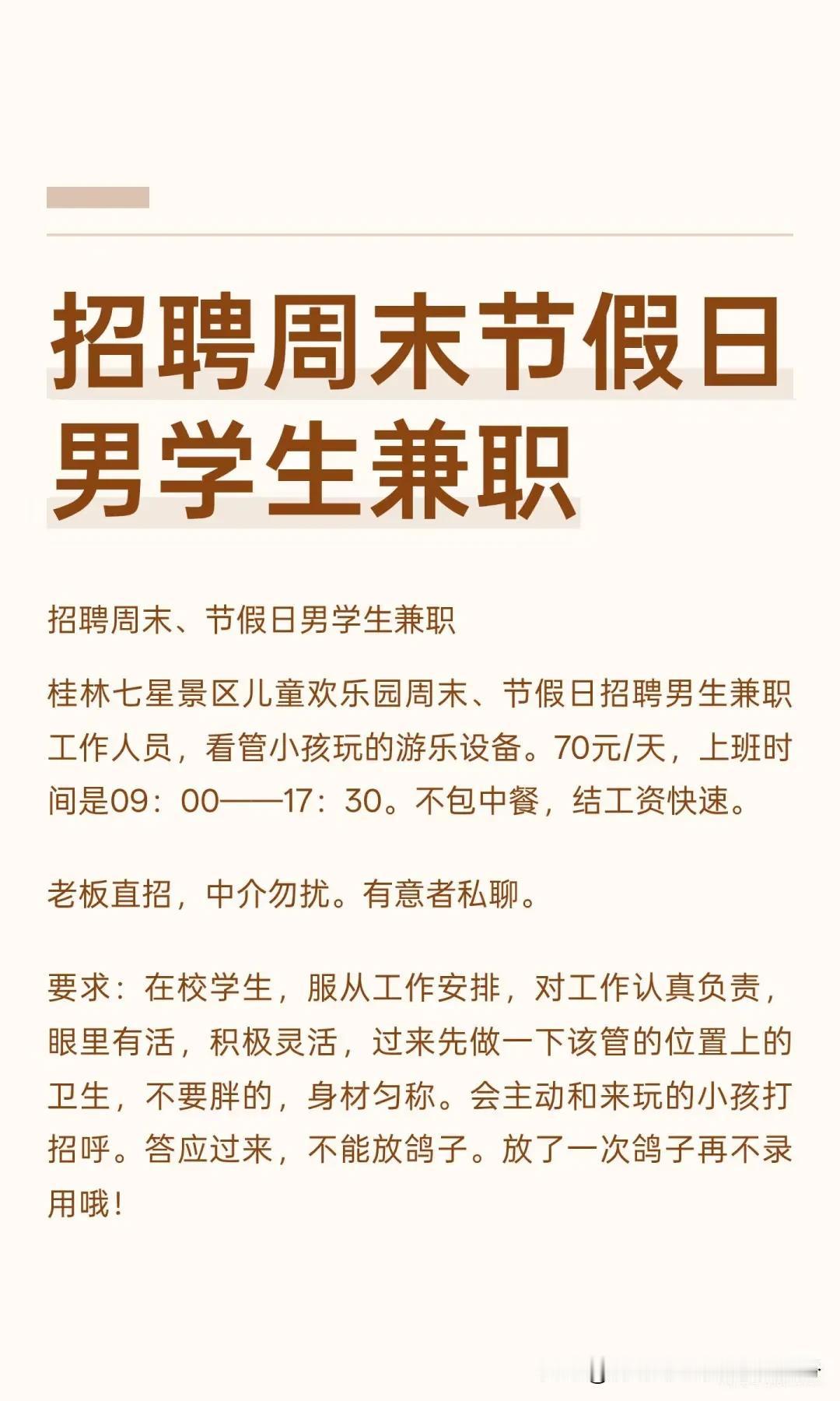 招聘周末、节假日男学生兼职 桂林七星景区儿童欢乐园周末、节假日招聘男学生兼职工作人员,看管小孩玩的游乐设备。70元/天,上班时间是09:00——17:30。不包中餐,结工资快速。 老板直招,中介勿扰。有意者私聊。 要求:在校学生,服从工作安排,对工作认真负责,眼里有活,积极灵活,过来先做一下该管的位置上的卫生,不要胖的,身材匀称。会主动和来玩的小孩打招呼。答应过来,不能放鸽子。放了一次鸽子再不录用哦!