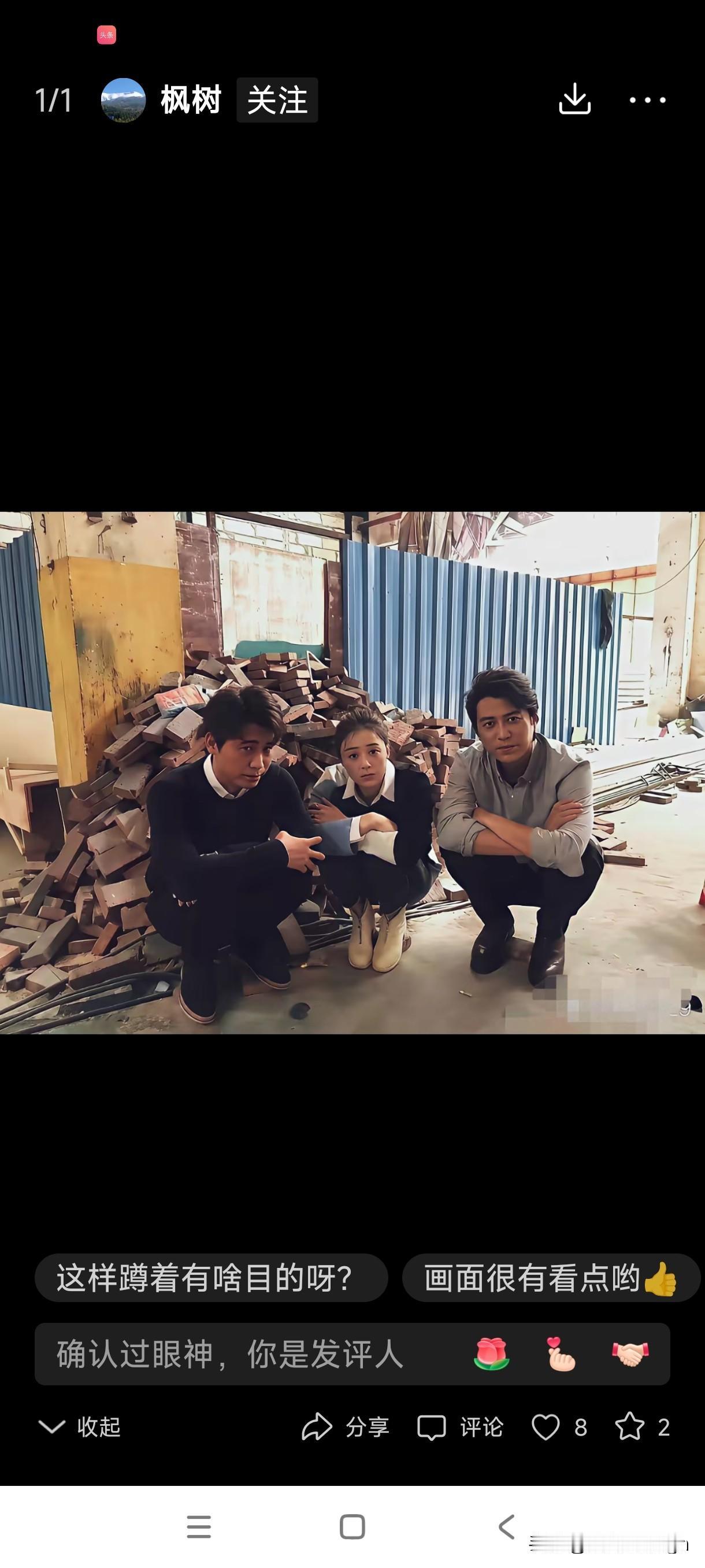 这张李乃文、蒋欣、靳东都蹲着抱着膀子,瞪着眼睛的照片,看着很有故事感,令人想象力很丰富! 蒋欣稳稳蹲在中间,靳东和李乃文分蹲两边,三人像约好似的齐刷刷瞪眼睛。最抢镜的是李乃文,斜着眼珠子瞪得格外夸张,活像突然看到什么离谱事儿,偏偏还得配合演出的样子,三张放大版的表情包,脸凑一块,莫名喜感! 三位都是演技与实力并存的演员,很喜欢他们的表演,播出他们的每一部剧都有在看,期待三位的合作表演。
