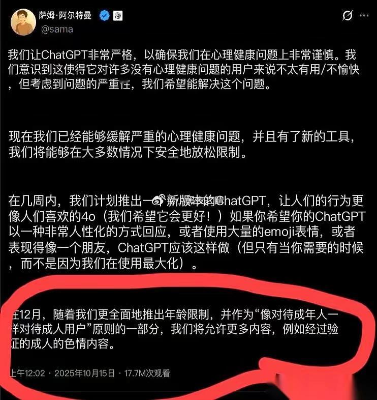 OpenAI的CEO山姆奥特曼,一本正经地解释,说他们要搞点“成人内容”,是为了
