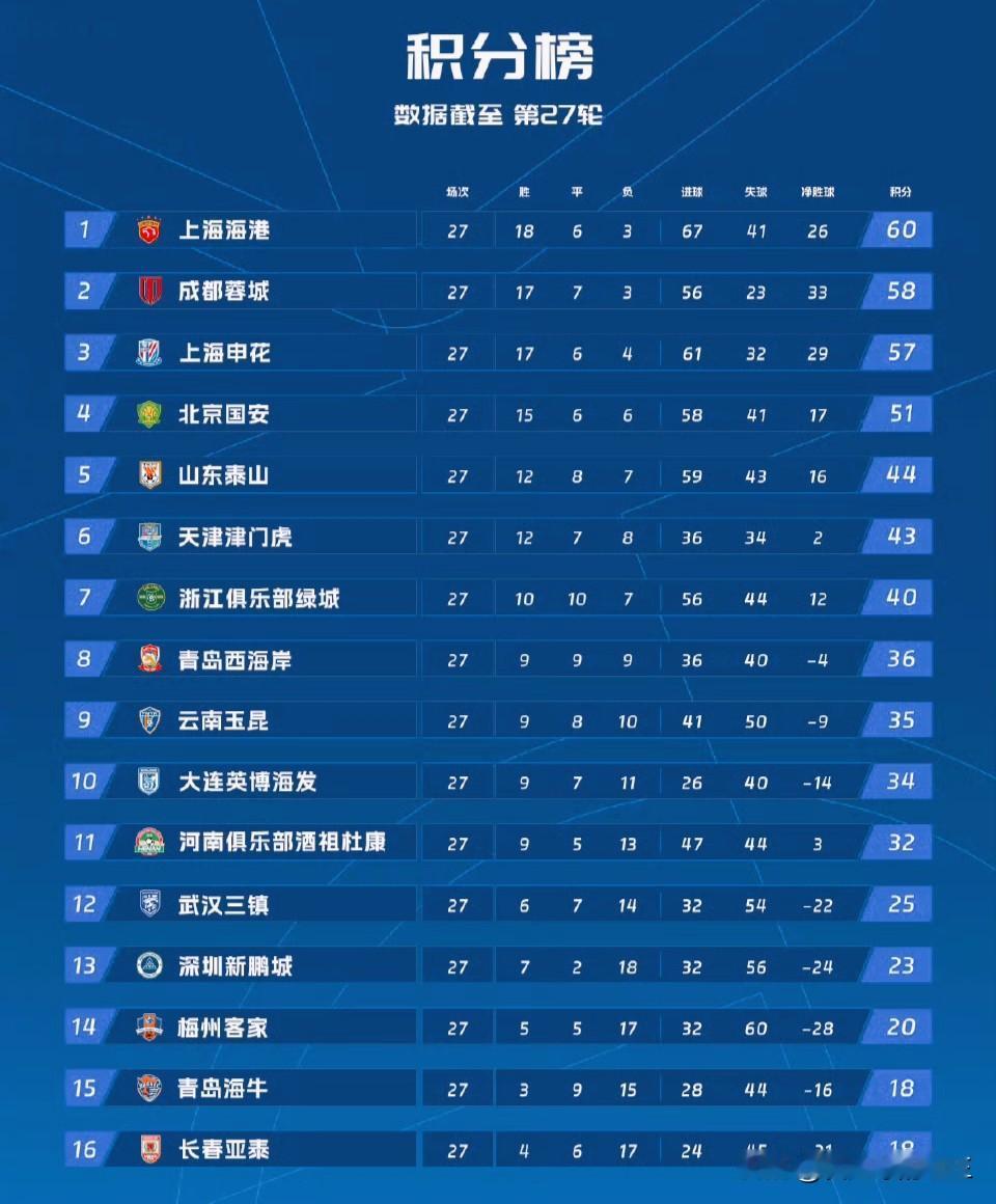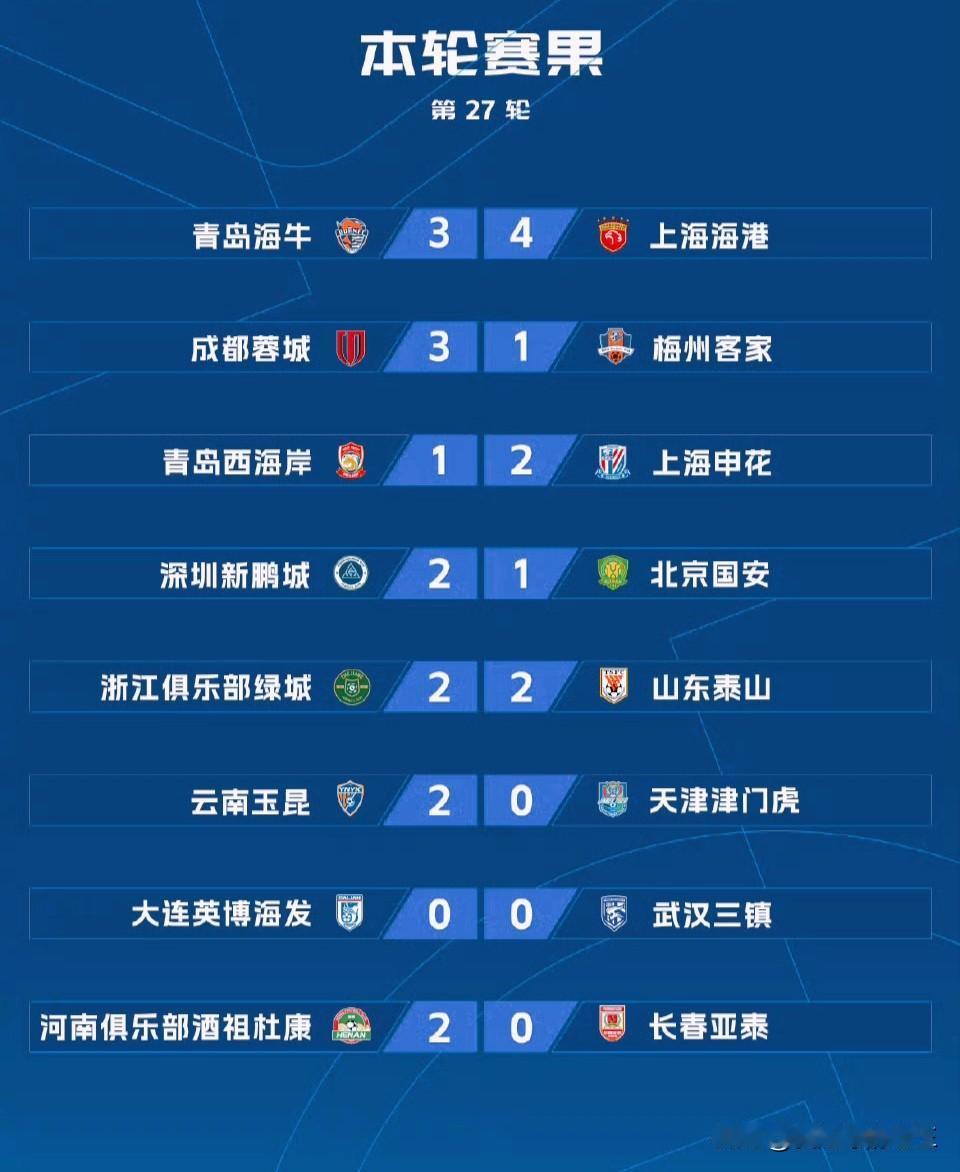 中超~第27轮战报和最新积分榜!! 本周末,刚刚结束的第27轮中超联赛,八场比