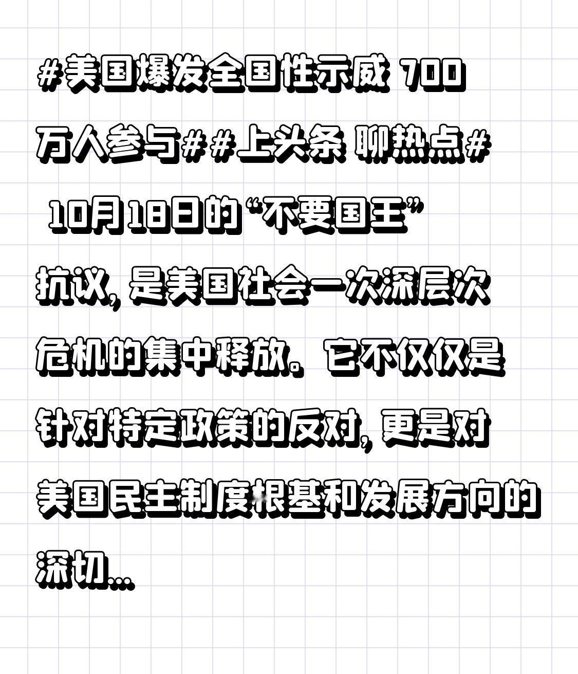 10月18日的“不要国王”抗议,是美国社会一次深层次危机的集中释放。它不仅仅是针对特定政策的反对,更是对美国民主制度根基和发展方向的深切忧虑。政治内耗、社会分裂与治理困境相互交织,使得美国正面临一场严峻的考验。后续发展关键取决于政府停摆能否尽快结束,以及执政团队能否以更包容、妥协的姿态回应民意。否则,美国的政治裂痕恐将继续加深。