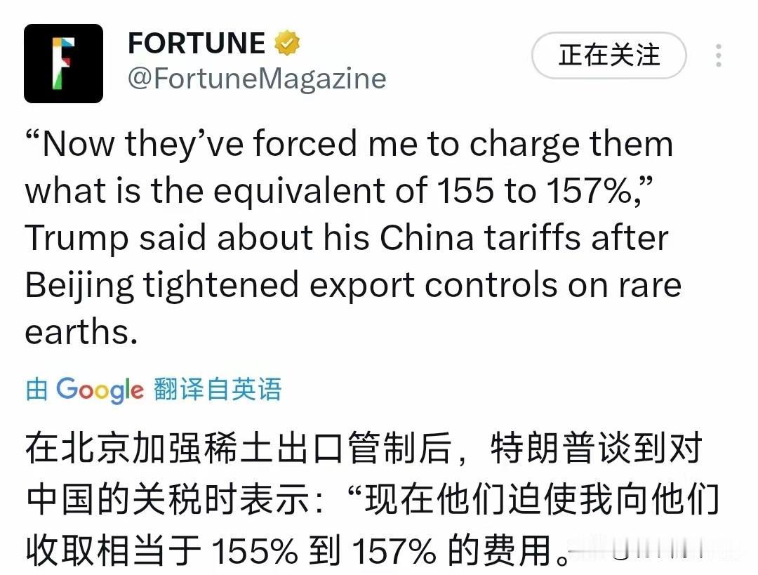 特朗普再次对我们撂话!10月19日,美国总统特朗普放话声称,他并不想摧毁中国,并指出他在第一个任期内征收了数千亿美元的关税。特朗普表示,新的关税现在相当于155%至157%,并称中方愿意达成协议。他计划两周后与中方在韩国会面。 很显然,特朗普一方面表示所谓的不想摧毁中国,一方面又试着举起关税大棒恐吓我们,而目的呢?目的只有一个,那就是让我们在谈判桌上作出更大的让步。说实话,特朗普根本不是不想摧毁中国,而是特朗普根本没有那个能力。此前特朗普把关税加到了145%,结果呢?结果是特朗普左等右等,等不到我们的电话,最后主动降温。 特朗普一而再的利用关税威胁我们,这说明特朗普已经黔驴技穷,只剩下这一招,而且关税牌的效果是越来越差。很显然,特朗普的重点是跟我们会面,要达成协议。我们没有要表态达成协议,也没有表态否认谈判。一句话,达不达成协议,这由中美谈判的结果来决定。而在这之前,美国肯定是意识到了一点,那就是不能在对我们做小动作了。