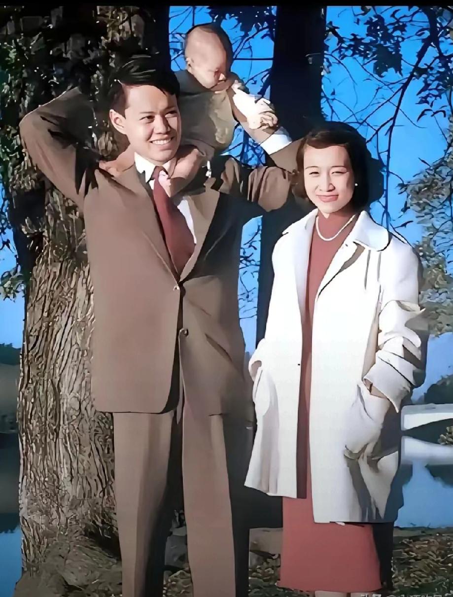 这是先生肩“挎”小孩和第一任妻子杜致礼合影。 当时的先生年轻帅气,