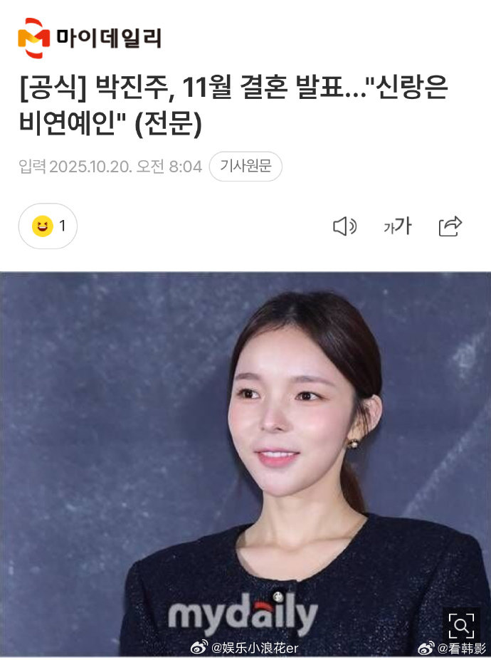 朴真珠官宣结婚据韩媒,演员朴真珠官宣11月30日结婚,丈夫为素人,婚礼采取非公