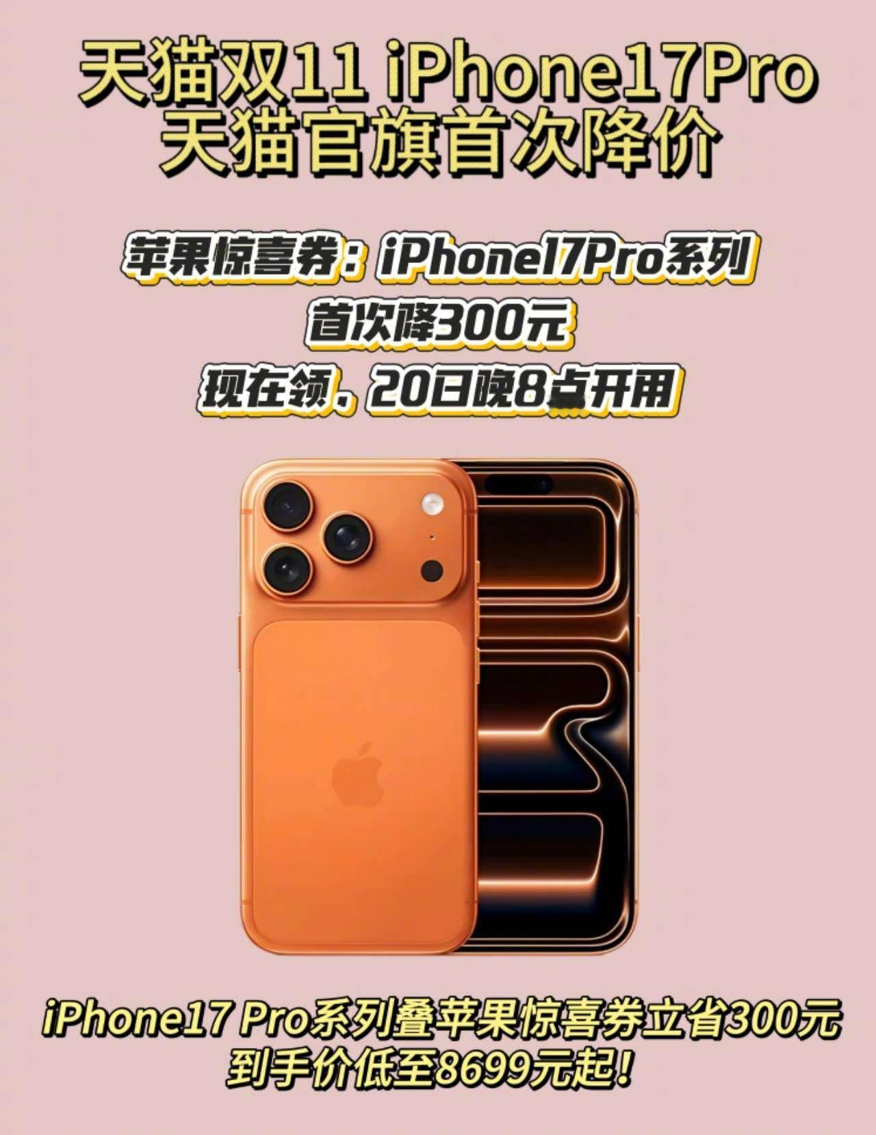 iPhone17pro天猫官旗首次降价 来了!作为苹果官方授权渠道,此次双11给出真金白银的优惠,直降300元,到手价仅8699元起!这可是官方旗舰店史无前例的价格突破,心动的果粉们,定好10月20日晚8点的闹钟,准备第一时间锁定新品优惠吧! ​​​