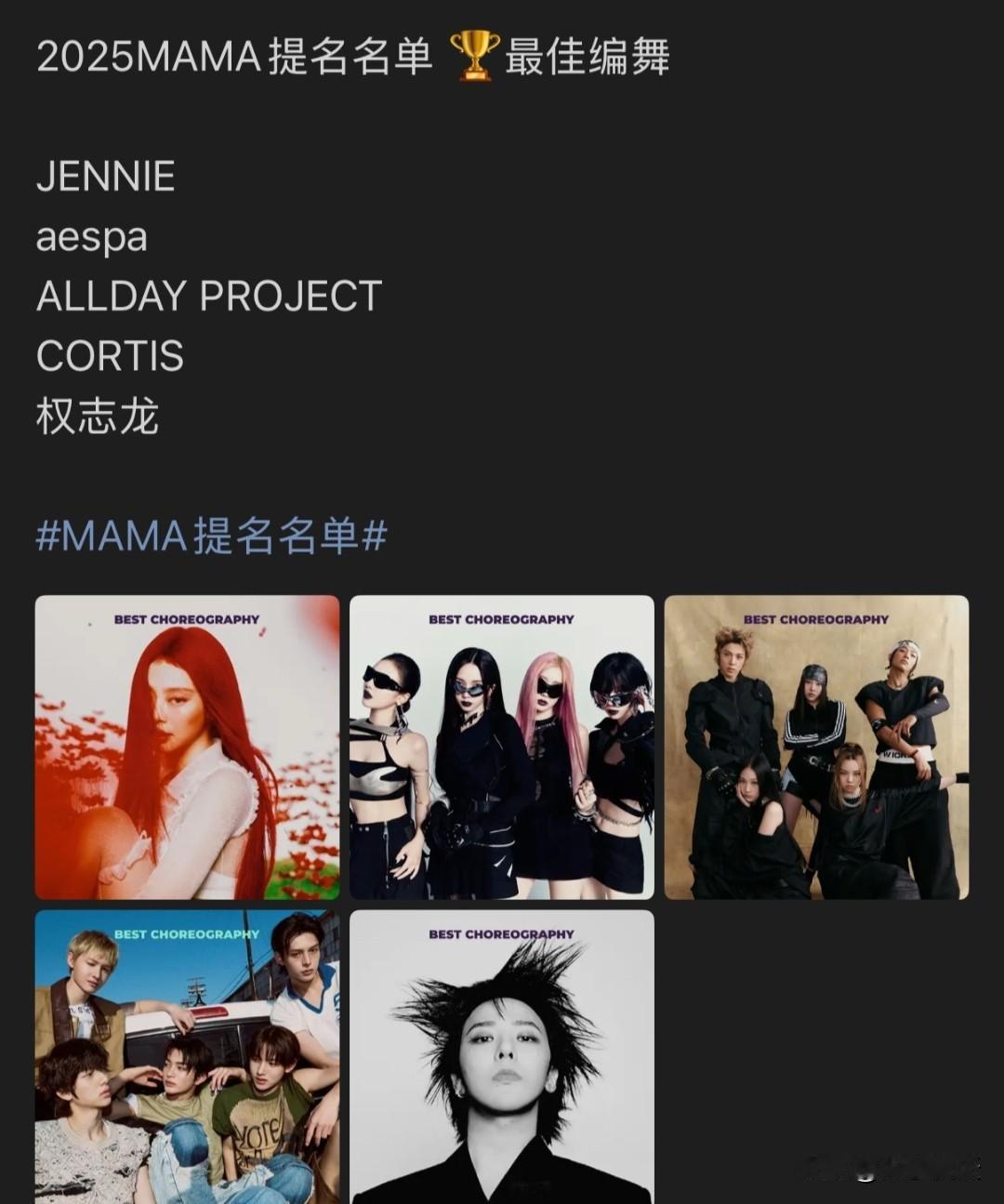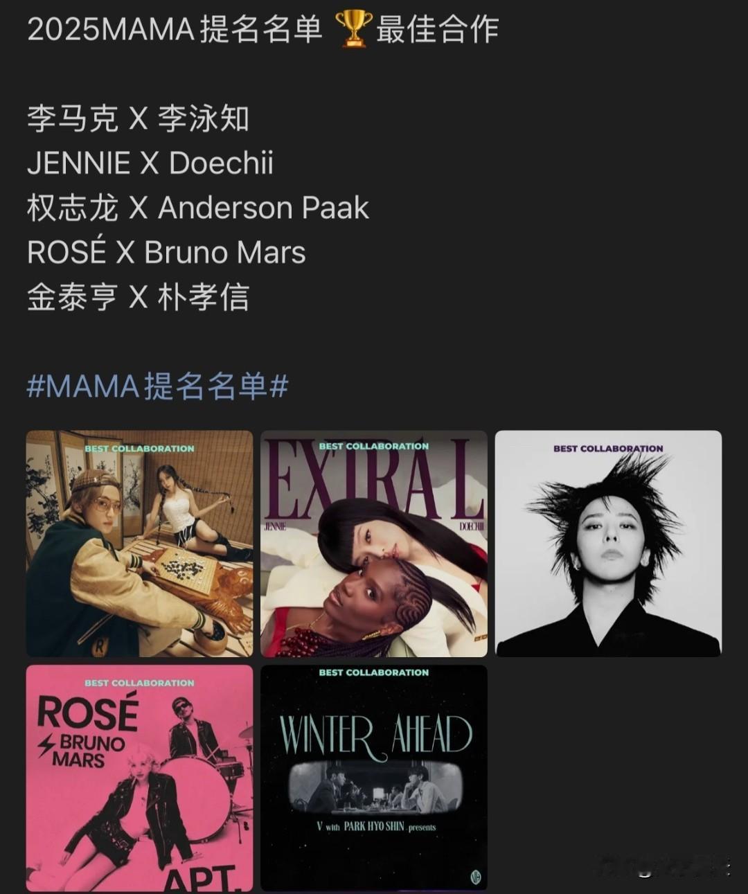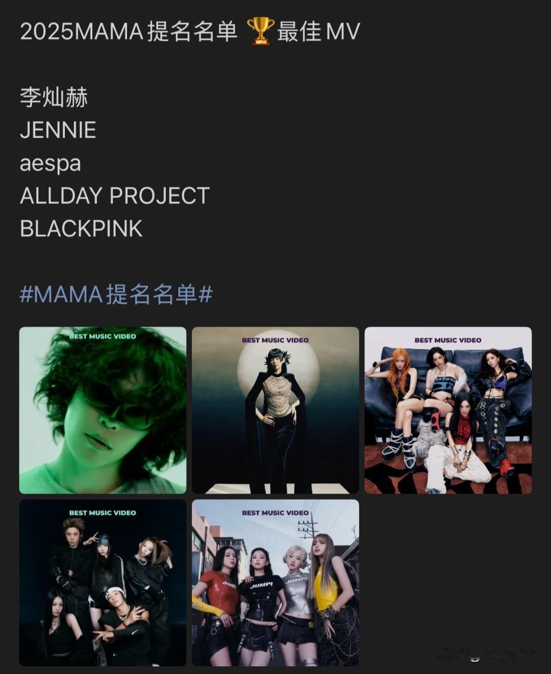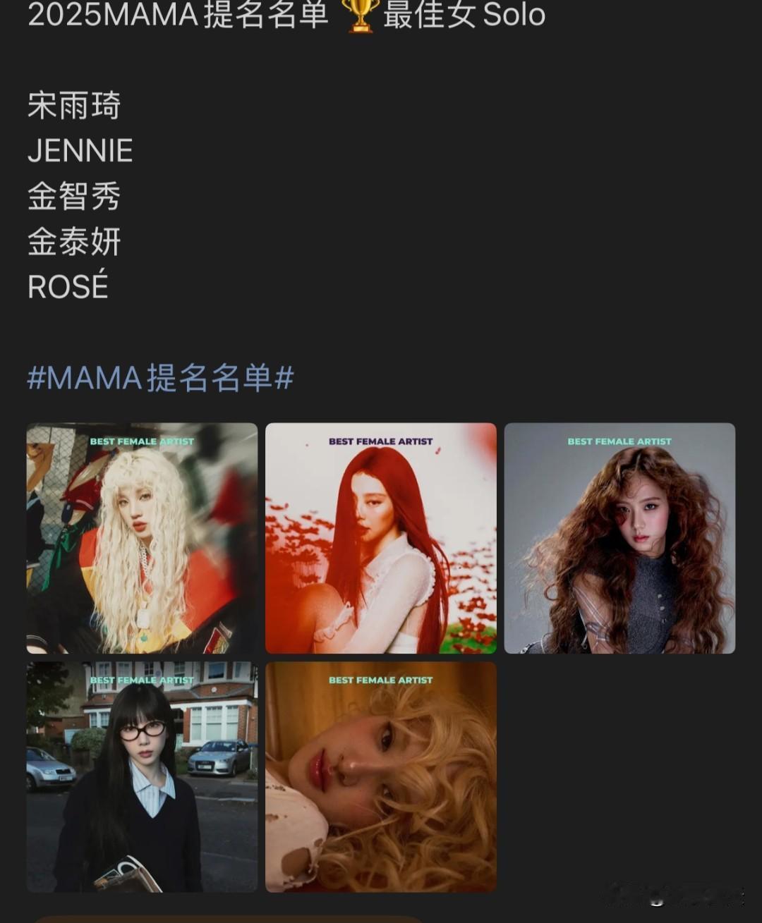 ennie拿下了今年MAMA九个提名,Kpop女solo最多不过这个奖嘛,不去现场基本拿不到,大家放平心态~~能拿到如此多的提名是非常厉害的程度🔥🔥🔥