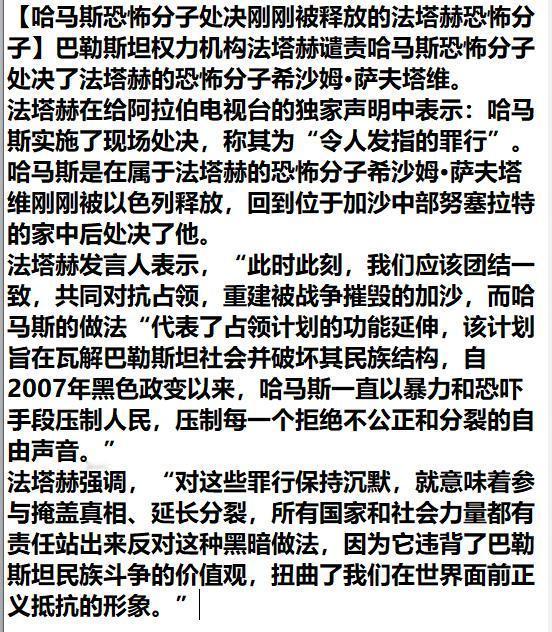 加沙内战【哈马斯恐怖分子处决刚刚被释放的法塔赫恐怖分子】巴勒斯坦权力机构法塔赫谴责哈马斯恐怖分子处决了刚刚被以色列释放的法塔赫成员希沙姆·萨夫塔维。