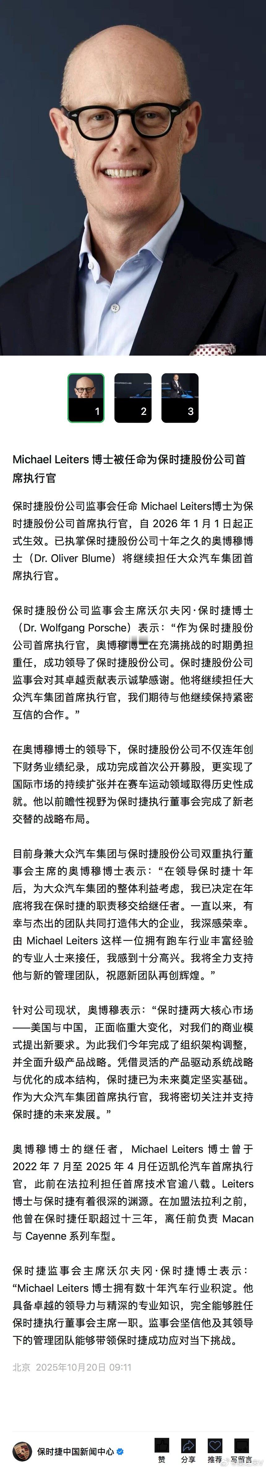 保时捷股份公司监事会任命 Michael Leiters博士为保时捷股份公司首席执行官,自 2026 年 1 月 1 日起正式生效。已执掌保时捷股份公司十年之久的奥博穆博士(Dr. Oliver Blume)将继续担任大众汽车集团首席执行官。