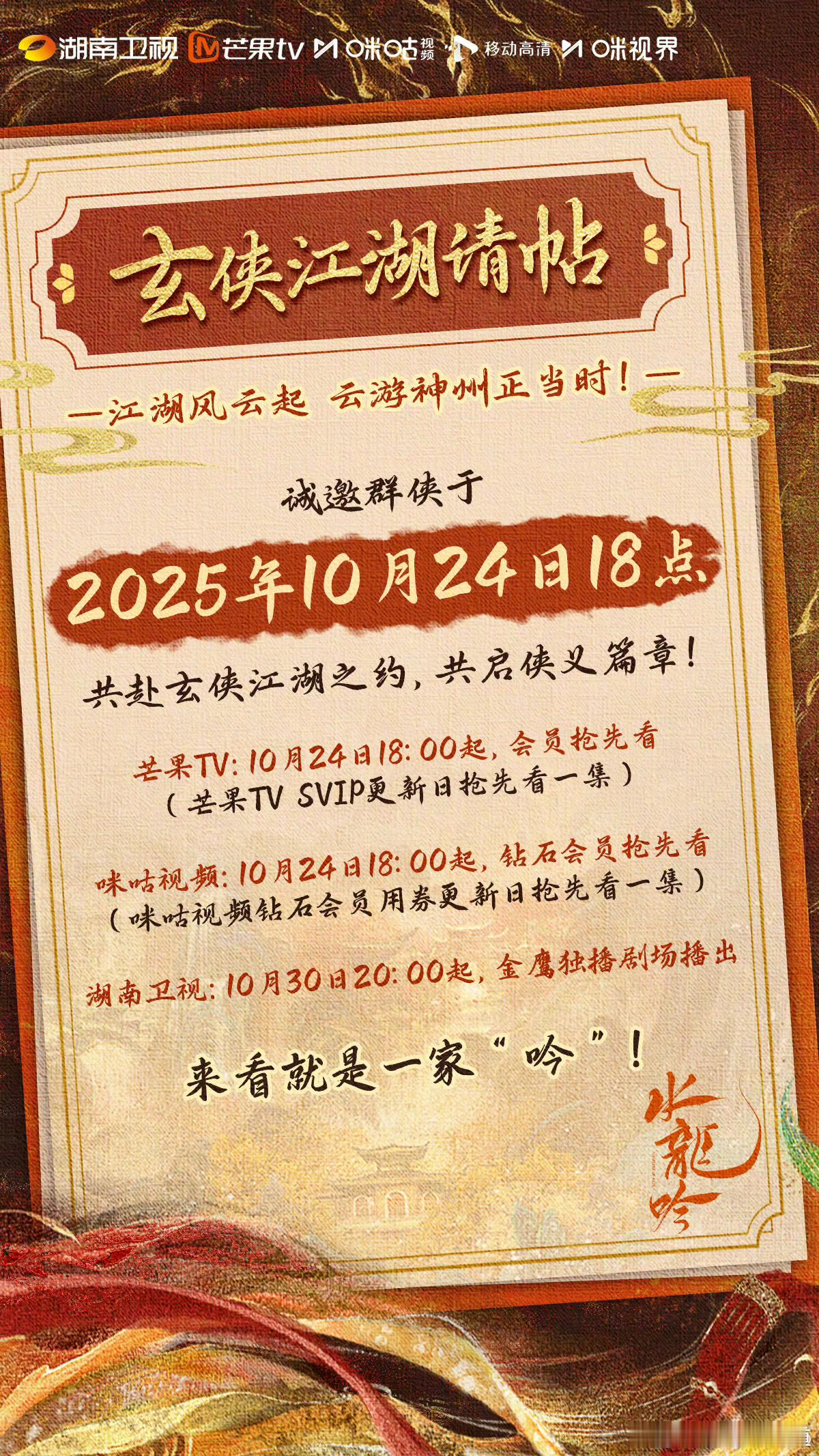 水龙吟定档水龙吟定档10月24日周五晚上上线,芒果大剧,特效看着挺不错,数据应该不会差。