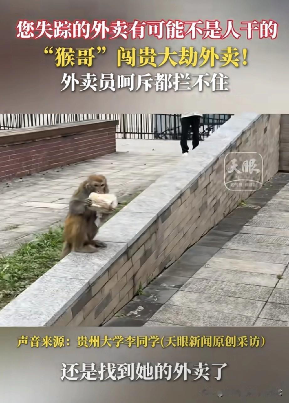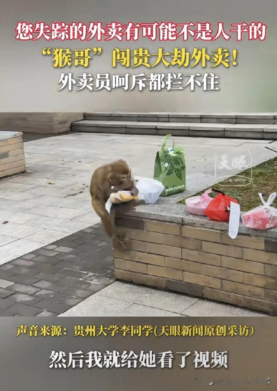 笑喷!外卖失踪竟是“猴哥”干的! 快来看这离谱事儿!某大学的外卖被猴子截胡了,“猴哥”光明正大抢外卖,吃得那叫一个香,外卖员呵斥都拦不住! 这画面太魔幻了,合着咱丢的外卖不一定是人拿的,可能是“猴届干饭王”干的!外卖员这锅背得冤啊,赔钱又赔功夫。 有人笑到岔气“这猴是成精了吧”,也有人心疼外卖员“这钱赚得太委屈”。咱就说,以后点外卖得防人还得防猴?你觉得这事儿该让谁买单?