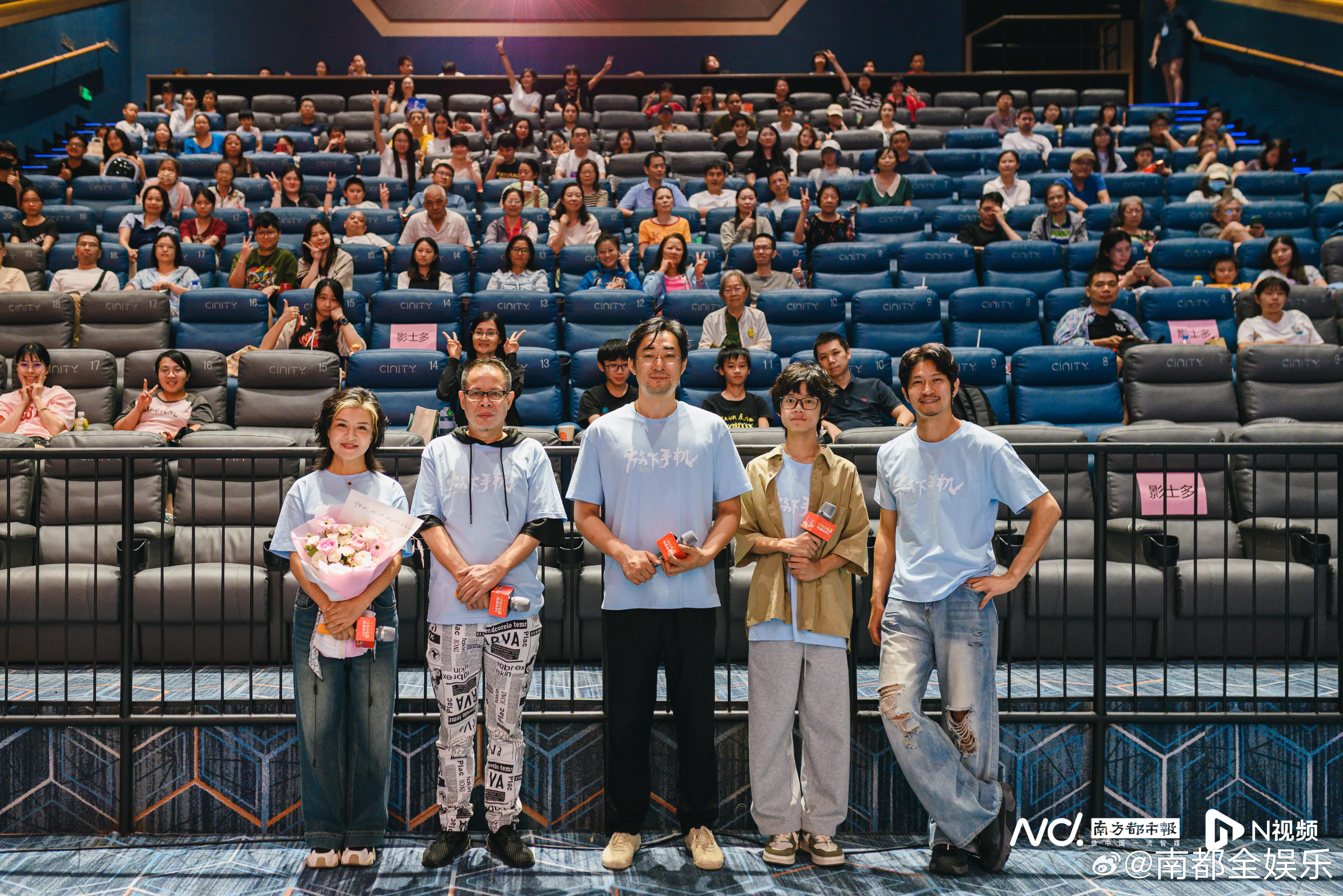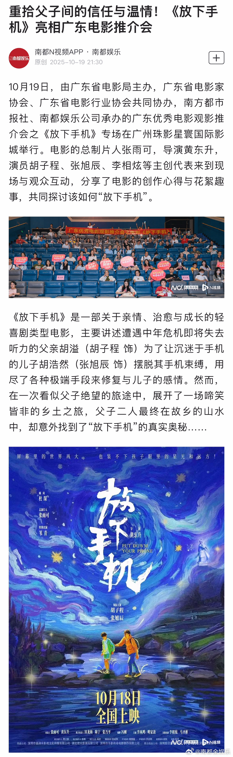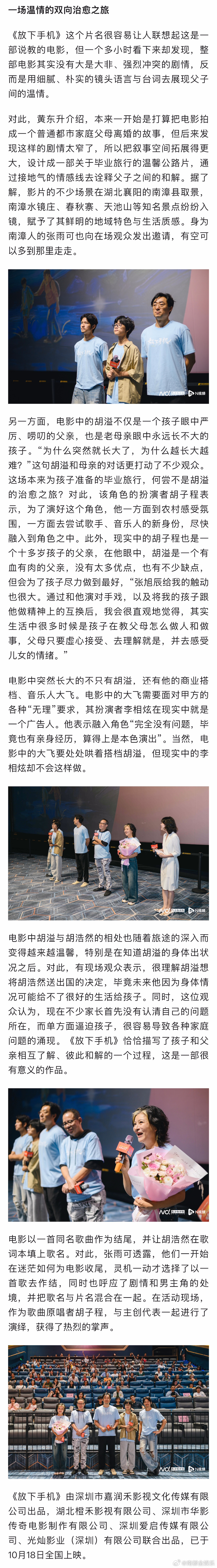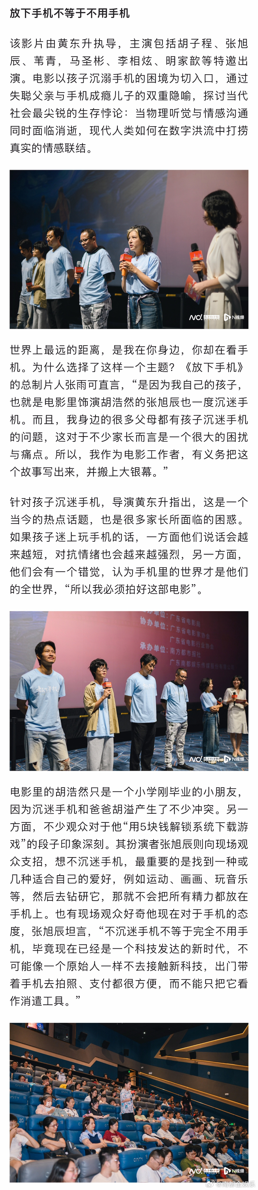 19日,广东优秀电影观影推介会之《放下手机》专场在广州珠影星寰国际影城举行。电影的总制片人张雨可,导演黄东升携演员胡子程、张旭辰、李相炫等主创代表来到现场,分享电影的创作心得与花絮趣事,共同探讨该如何“放下手机”。电影放下手机