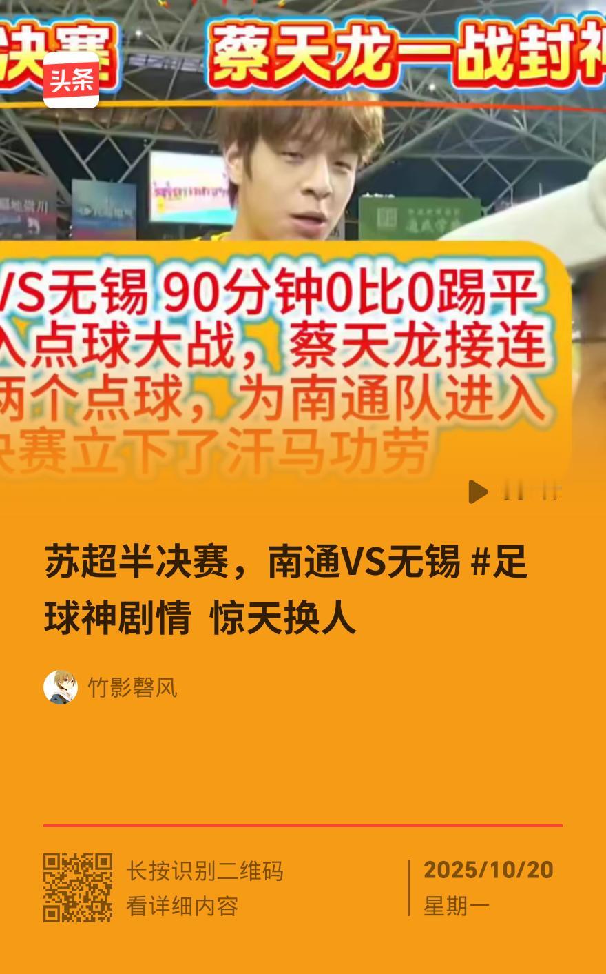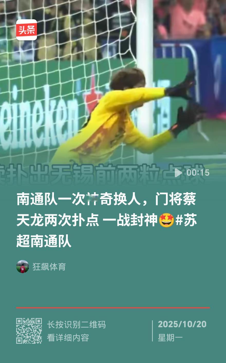 苏超惊天神换人!20岁替补门将连扑2点封神,赛后喊出冠军宣言 苏超半决赛上演“爽文级”名场面!10月19日南通对阵无锡的比赛,90分钟0-0闷平拖入点球大战,南通主教练鲁强终场前的“神仙换人”直接改写结局——替补门将蔡天龙登场后连扑两粒点球,助球队4-2闯进决赛! 这场球前90分钟堪称“催眠局”。南通主场狂攻却屡失良机:张浩楠传中变吊门擦柱而出,程鑫反击打了高射炮,金成民头球攻门偏出。无锡仅靠薛天的半单刀打边网制造过威胁。就在所有人以为要拼运气时,鲁强果断换上蔡天龙,这个1米90、被球迷戏称“大蚂蚱”的20岁小将,成了胜负手。 点球大战全程高能!无锡张午首罚就被蔡天龙扑出,紧接着吴磊的射门又被他单掌托出,现场直接沸腾。赛后蔡天龙坦言“赛前早做好准备”,提到扑出两球时直言“太激动,想哭”。主教练鲁强则揭秘“每步都有预案”,这波换人是战术部署的关键一环。 球迷吵翻了天:有人说蔡天龙是“点球终结者”,无锡前两球质量差刚好给了机会;有人力挺教练“没有伯乐,千里马难发光”。更燃的是,蔡天龙赛后直接喊出“拿冠军”,南通决赛将对决点球大战淘汰南京的泰州队。 这波“战术+实力”的完美配合够震撼吗?你觉得蔡天龙和教练谁是真功臣?南通能拿下决赛冠军吗?来评论区聊聊~苏超南通队 苏超无锡队 江苏苏超