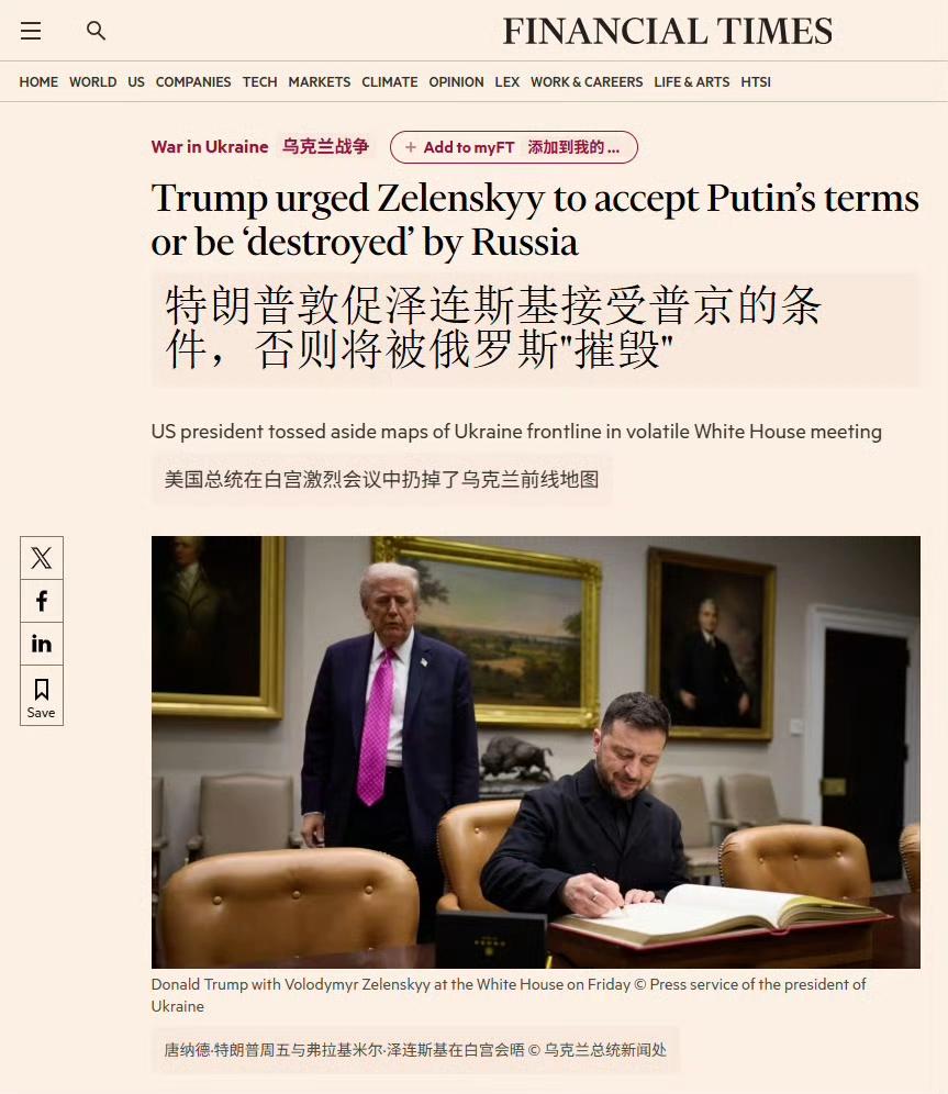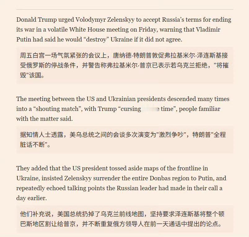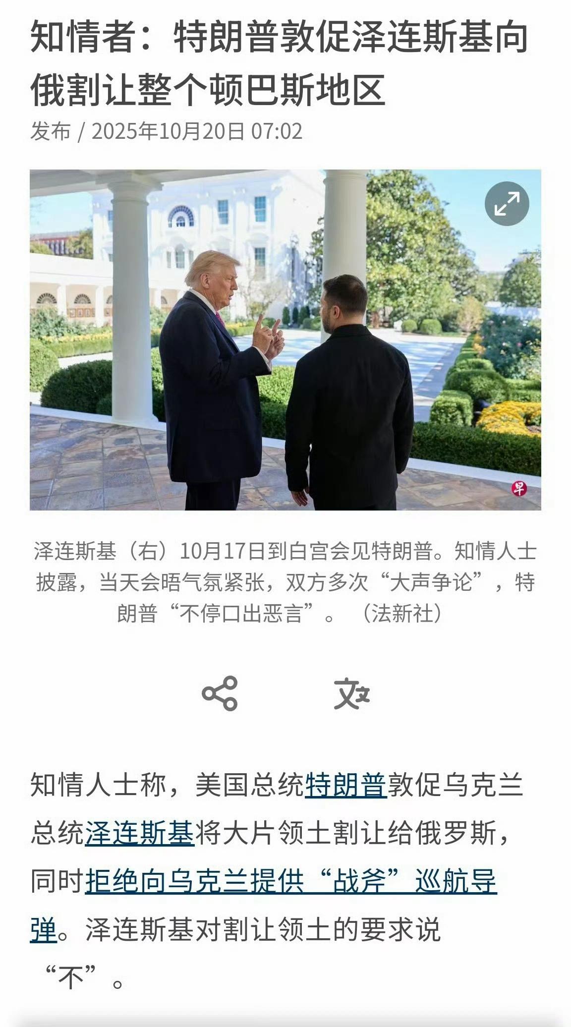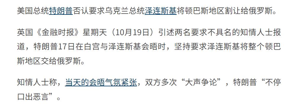 根据《金融时报》、《法新社》、《联合早报》等多家外媒报道,10月17日,特朗普与泽连斯基竟然在会晤过程中再次爆发激烈争吵,特朗普怒火冲天,将泽连斯基骂了个狗血淋头,导致最后整个会晤不欢而散。 这个报道出乎了所有人预料,在10月17日会晤之前,特朗普对乌克兰的态度其实很不错,当时舆论都认为这一次会晤,乌克兰将得到特朗普的更多支持,甚至有可能从特朗普那里得到“战斧”导弹,可万万没有想到,结果走向了反面,特朗普不仅没有支持泽连斯基,还对他破口大骂,对乌态度一百八十度大转弯。 之所以如此,《联合早报》注意到,是因为特朗普在与泽连斯基会晤前一天与普京通了电话,这一次电话会谈中,普京表示,如果乌克兰能够割让顿巴斯地区的领土,那么俄罗斯就同意停火。 这让特朗普十分兴奋,毕竟他最渴求的一点就是能够叫停俄乌冲突,现在普京提出了这个条件,他只需要施压泽连斯基答应这个条件,俄乌之间就能就此停火,他就能从中获得巨大威望。 只可惜,泽连斯基当场拒绝了这个提议,这也就让特朗普大为光火,怒到极致,新仇旧恨一起涌上,当场就把泽连斯基骂了个狗血淋头,最后这次会晤双方不欢而散。 至于会晤之前,泽连斯基期待的战斧导弹,自然也就泡汤了,但这表面看起来是乌克兰的损失,实际上如果深入思索,就能发现特朗普在这个过程中的尴尬。 他看似是美国总统,拥有巨大的权势,可无论是普京还是泽连斯基,都有自己的主意,都有自己的底线,谁也不会听他的。 刚开始特朗普是想要施压乌克兰,让泽连斯基屈服,后面他又施压俄罗斯,威胁说要对俄罗斯展开更加全面的制裁,以此希望让普京退让,但都失败了,他上任之初,夸下海口,说要在24小时内结束俄乌冲突,现在这个承诺已经成了一个彻头彻尾的笑话。 特朗普在俄乌问题上的表现,完美体现出了他糟糕透顶的外交能力,他只有在面对软弱对手时才能靠极限施压取得一点成果,但如果面对的是泽连斯基、普京这样的强硬角色,就立刻束手无策了,结果就是变成了现在这个样子:每次会晤商谈,都以无能狂怒收场。