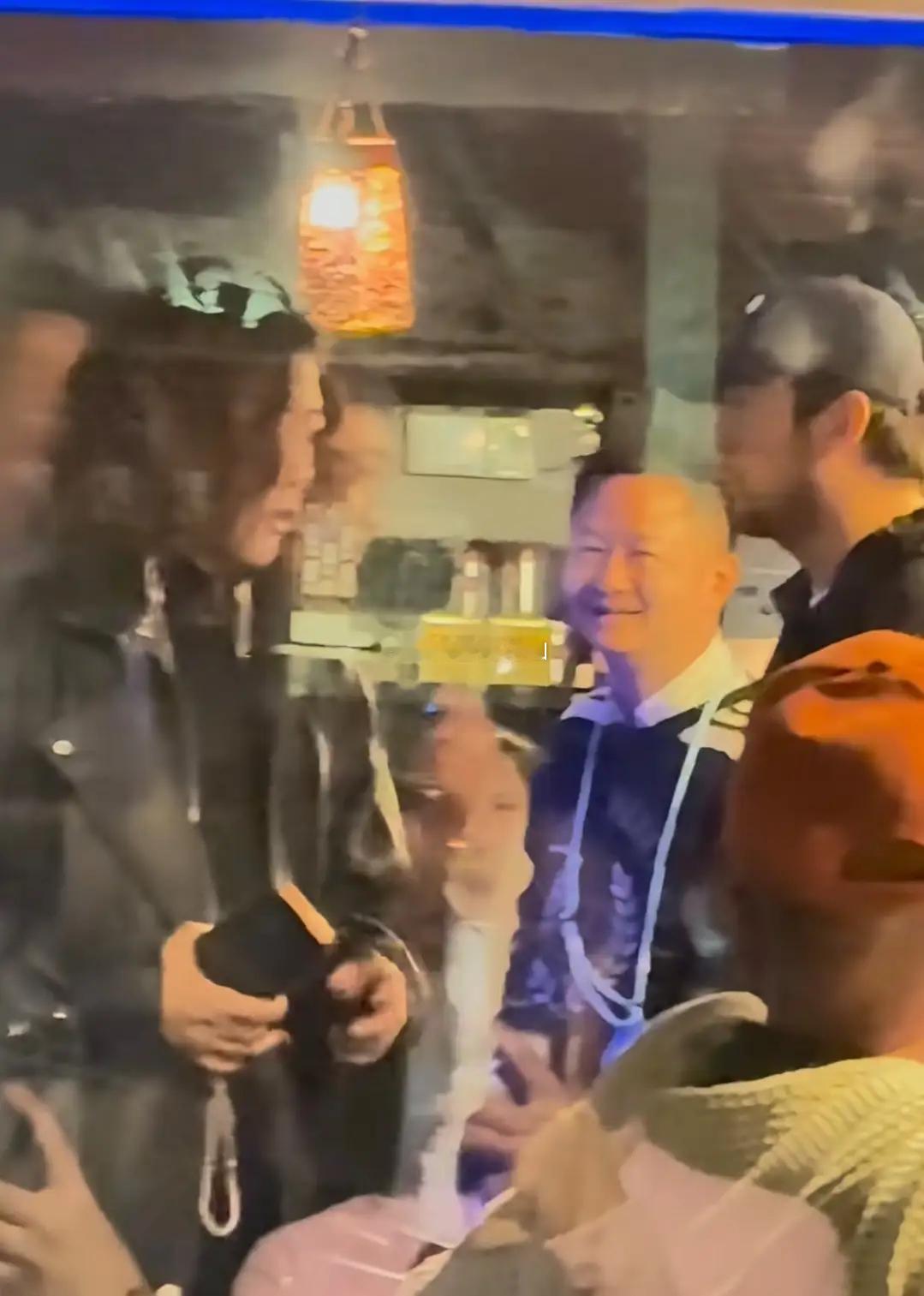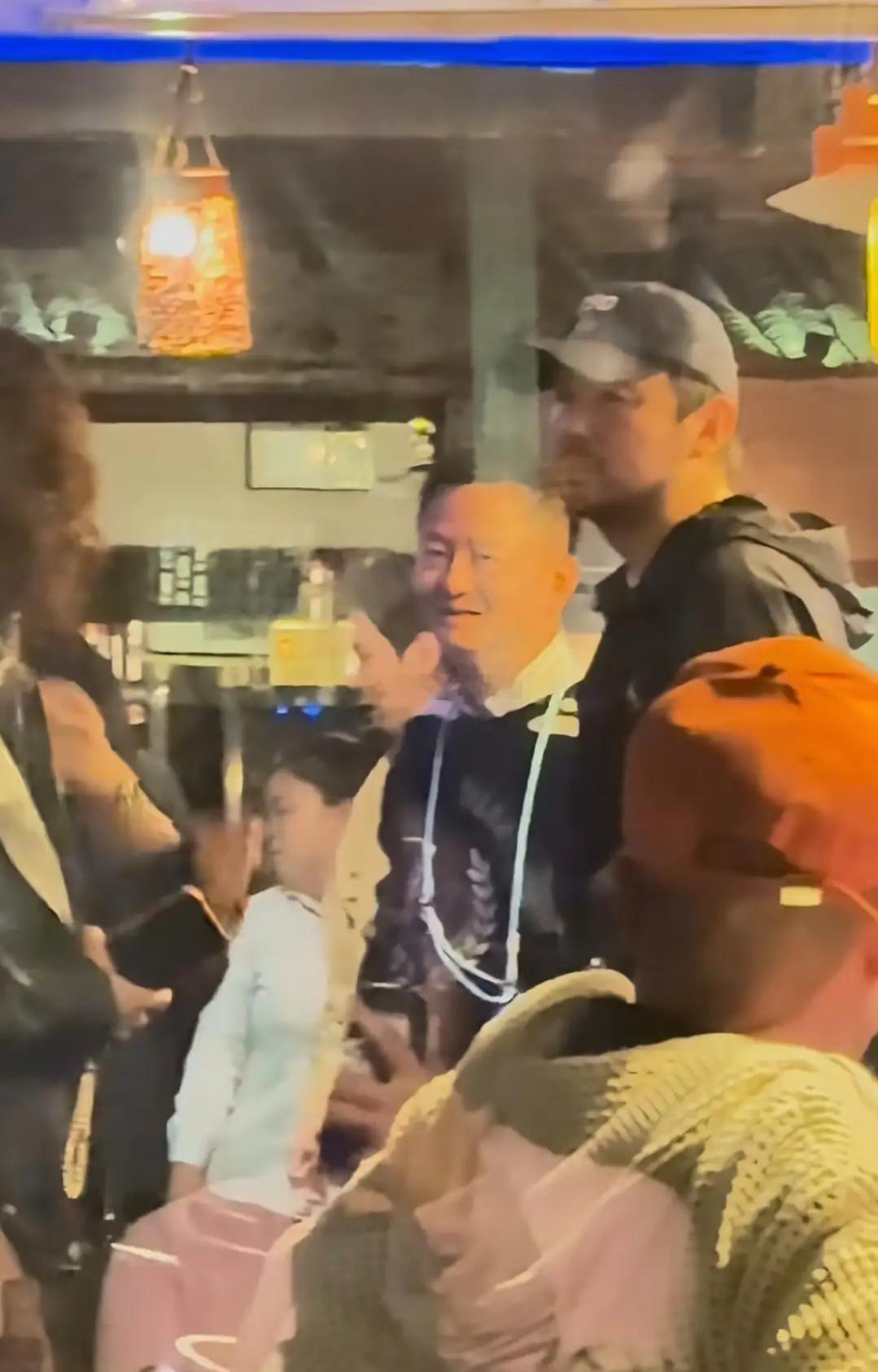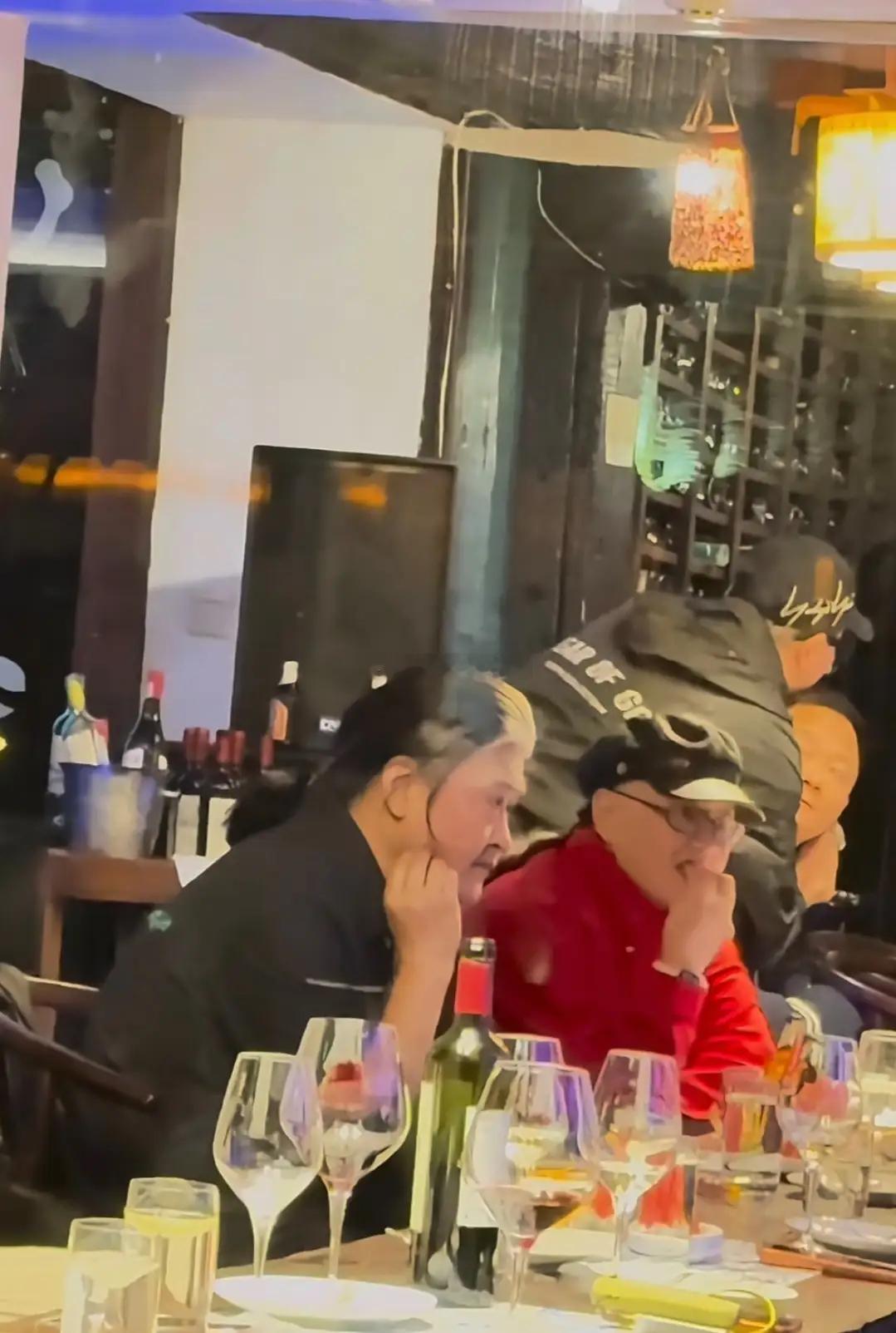 作为餐厅主人,黄磊全程如东道主般忙碌,穿梭于宾客间热聊举杯,笑容满面,看来这场聚会正是由他牵头。昏黄灯光下,刘欢扎着长发,白发依稀可见,黑色上衣衬得身形清瘦了些,身旁疑似戴锦华的身影戴着帽子,红色上衣格外惹眼,两人桌前酒杯林立,一瓶酒已见空底。