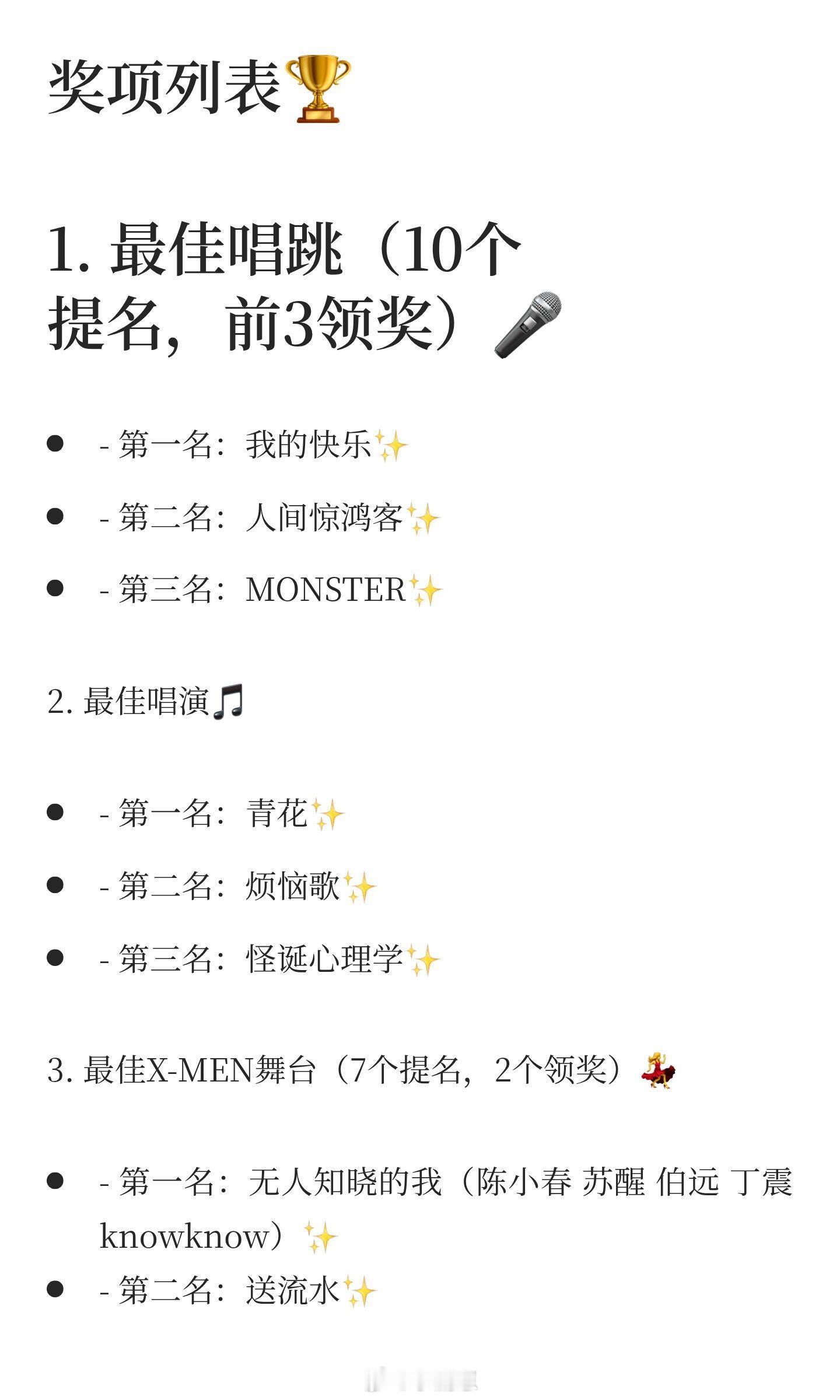 1. 最佳唱跳(10个提名,前3领奖)🎤