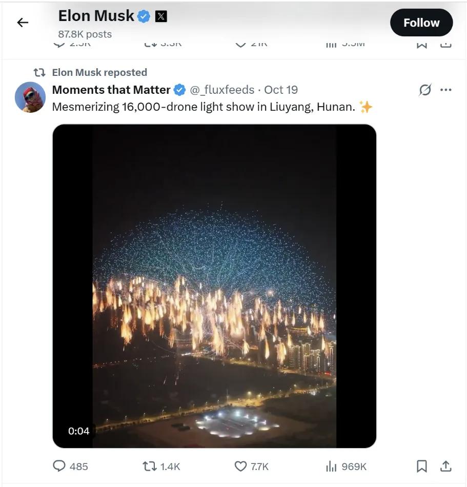“惊叹了,烟花进化到这个程度了吗?”近日,浏阳发布烟花文化节的预告视频,近1万6000架无人机表演的地球、大树、花环,引起了马斯克的转发!(来源:微浏阳) 10月17日,作为第十七届浏阳花炮文化节的子活动,“聆听花开的声音”日景焰火表演与“一朵属于我的烟花”网络烟花节活动。 举办方凭借烟花联动无人机编队的惊艳表现,一举打破两项吉尼斯世界纪录,让全球见证浏阳烟花的创新实力。 这次网络烟花节,还进行了日景烟花表演,在白天用烟花的颜色创造出七彩的光环,场景令人惊叹! 这一幕,连世界首富也为之称赞,马斯克在他的朋友圈转发了浏阳的烟花视频,称这就是未来的世界,这就是科技的展示! 浏阳以烟花为媒,将创意进行到底,用绚丽的烟花装点着这美好的时空。在喜庆的场景、重大的节日,都能看见烟花的绚烂。 10月·每日幸运签浏阳超美烟花 浏阳烟花无人机 聆听花开的声音 一朵属于我的烟花 @秋实99 关注人生冷暖,拥抱幸福生活!