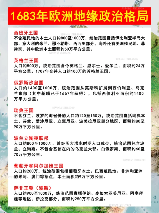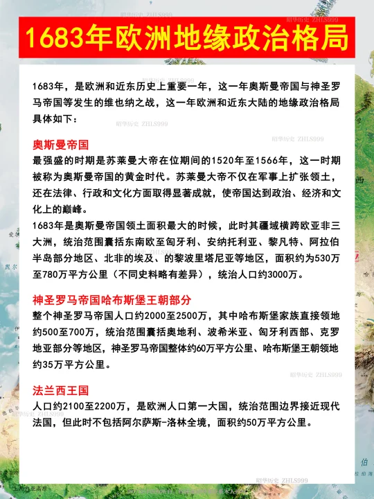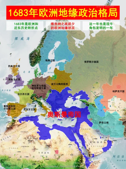 1683 年,是欧洲和近东历史上重要一年,这一年奥斯曼帝国与神圣罗马帝国等发生的维也纳之战,这一年欧洲和近东大陆的地缘政治格局具体如下: