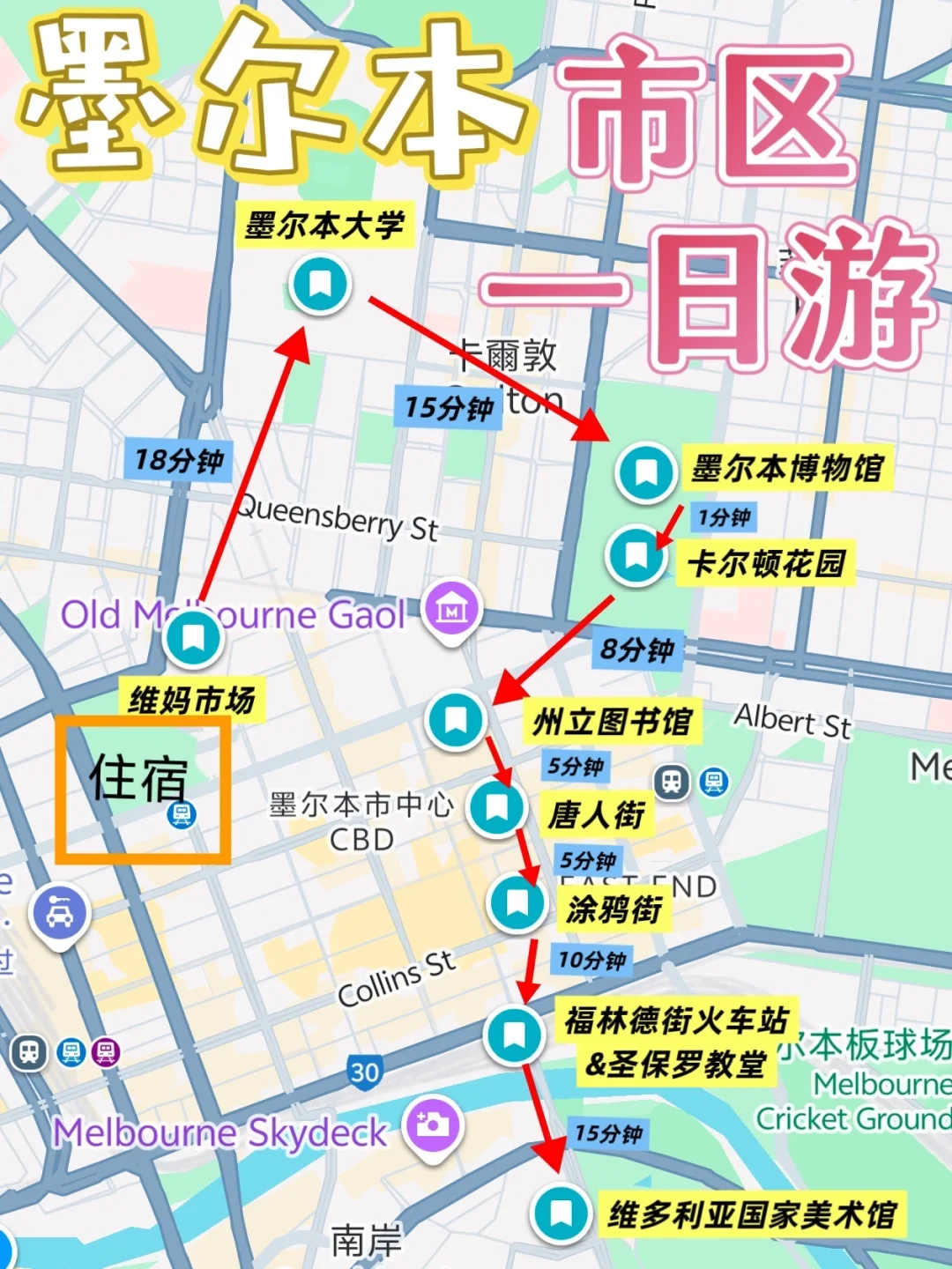 然后依次按照维妈市场➡️墨尔本大学➡️墨尔本博物馆➡️卡尔顿花园➡️州立图书馆➡️唐人街➡️涂鸦街➡️圣保罗教堂➡️福林德街火车站➡️国家美术馆的顺序游览,这条路线全程不走回头路,而且都是溜达着就走完(需要的时间标注在图中啦)最大程度优化了脚程👍🏻如果不爱走路也可以电车,基本都在电车的免费区,特别方便。