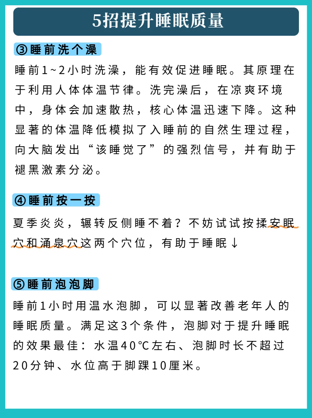 睡前 1 小时用温水泡脚,可以显著改善老年人的睡眠质量。水温 40℃左右、泡脚时长不超过 20 分钟、水位高于脚踝 10 厘米。