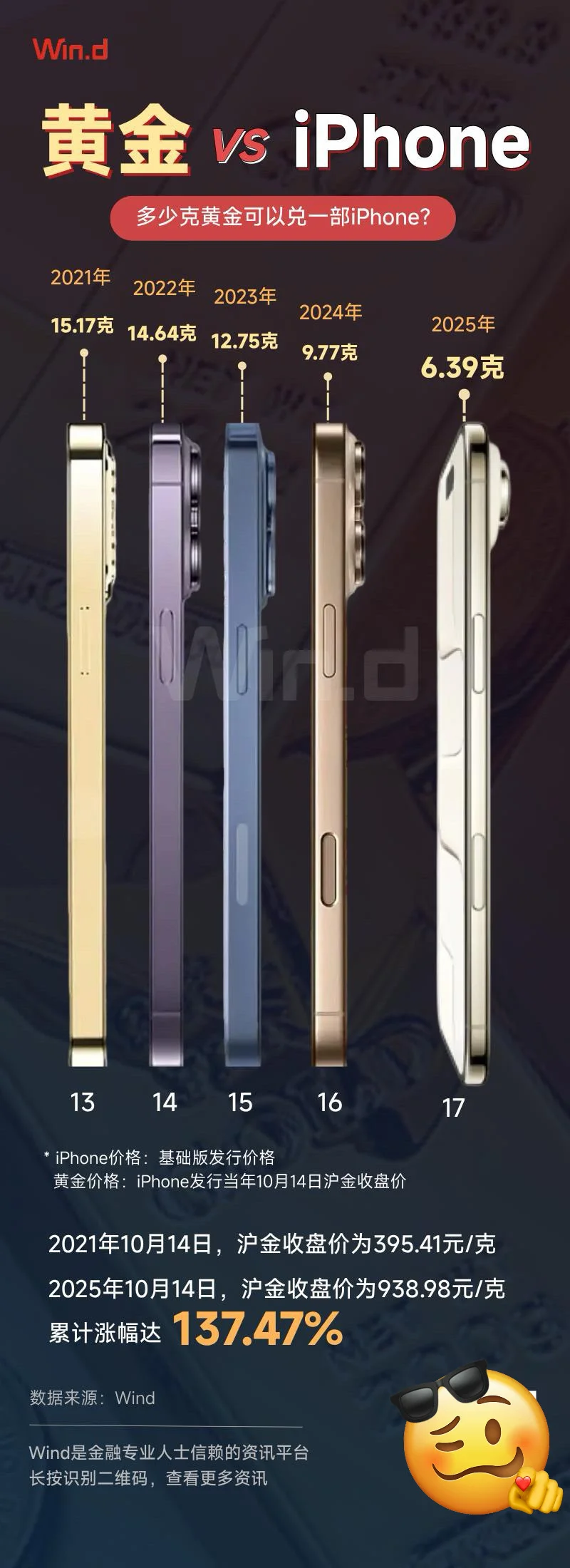 ⸻ 💰 图表解读:黄金价格跑赢科技潮,买iPhone的“克重”越来越轻 这张由Wind发布的图表,用一种极具冲击力的方式揭示了近四年黄金价格的飙升趋势。通过比较“买一部iPhone所需的黄金克数”,它直观展示了黄金价值增长与消费品价格之间的剪刀差。换句话说,同样是一部iPhone,2025年所需的黄金已经比2021年少了整整一半以上。 ⸻ 📈 黄金与iPhone的四年对比:财富的“重量”在变化 2021年,一部iPhone 13需要约 15.17克黄金。 到了2022年,这个数字降至 14.64克; 2023年为 12.75克; 2024年进一步降至 9.77克; 到2025年,仅需 6.39克黄金 就能换一部iPhone 17。 这意味着四年间黄金价格上涨超过 137%,而iPhone价格几乎保持稳定。 ⸻ 🏆 数据背景:金价四年涨幅137.47%,成为隐形赢家 根据Wind数据,2021年10月14日沪金收盘价为 395.41元/克, 2025年10月14日涨至 938.98元/克,累计涨幅高达 137.47%。 这不仅反映出全球通胀背景下黄金作为“避险资产”的强劲吸引力,也揭示出科技消费品在购买力面前的相对“贬值”。 ⸻ 🔍 财富启示:iPhone是消费品,黄金是时间的存折 过去几年,黄金和iPhone几乎成为两种不同的财富象征:一个代表即时享受,一个代表长期价值。 如果你在2021年买了一部iPhone,它今天可能早已贬值;但如果当时买的是等价黄金,如今的价值几乎翻倍。 这一对比提醒人们:在高通胀和货币宽松的时代,储蓄在银行贬值,而“硬资产”正在悄悄增值。 ⸻ 📊 延伸意义:科技迭代快,资产保值难 iPhone每年更新迭代,功能愈发强大,但保值性却逐年下降;而黄金虽无创新,却以稀缺和稳定性赢得时间。 这不仅是金价上涨的故事,更是消费主义与理财观念的较量——你是选择即时满足,还是选择时间复利? ⸻ 📣 一句话总结: “四年前的15克黄金,现在只要6克就能买到同样的iPhone——财富不会消失,只是从手机里,流进了金条里。”
