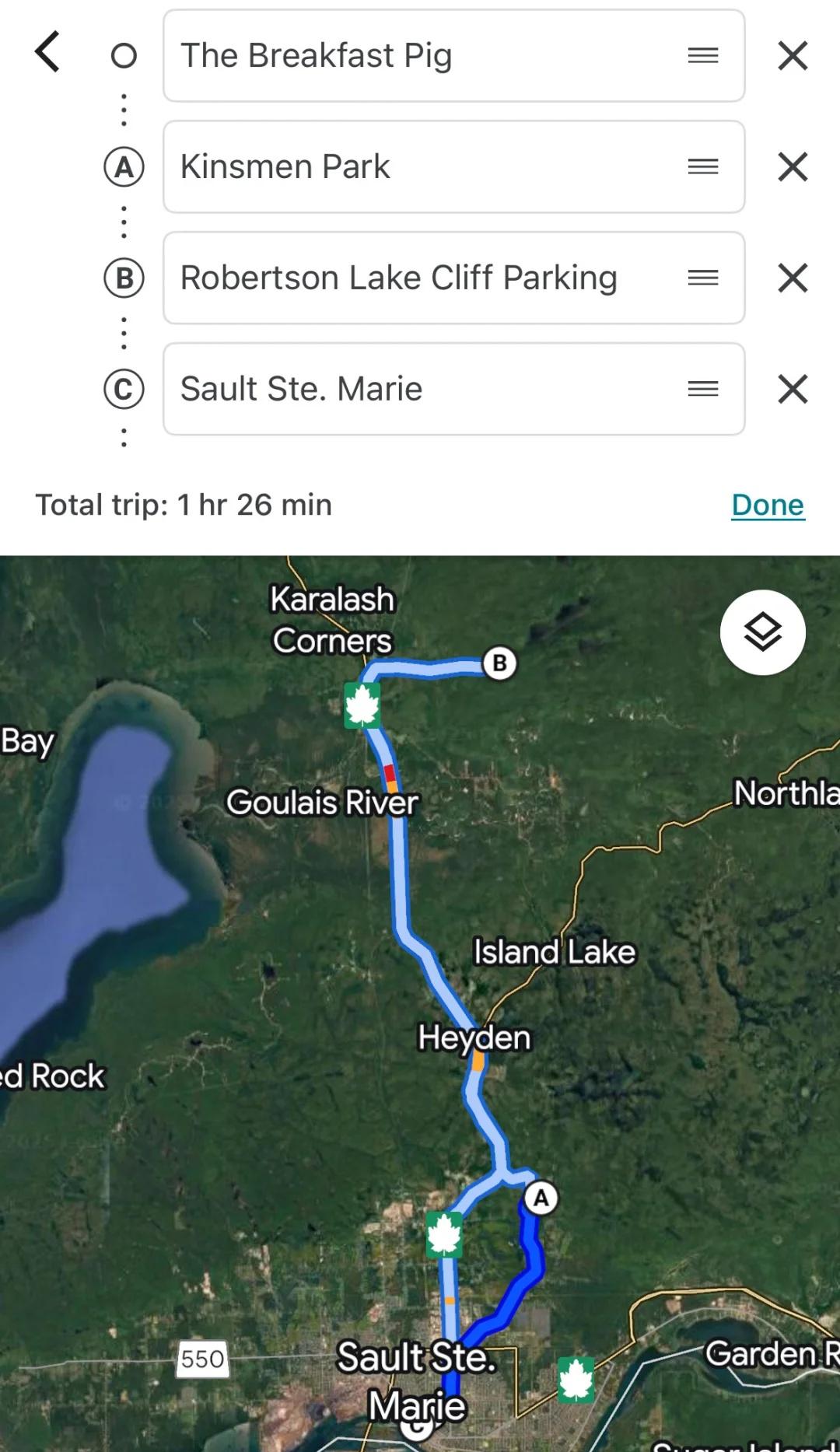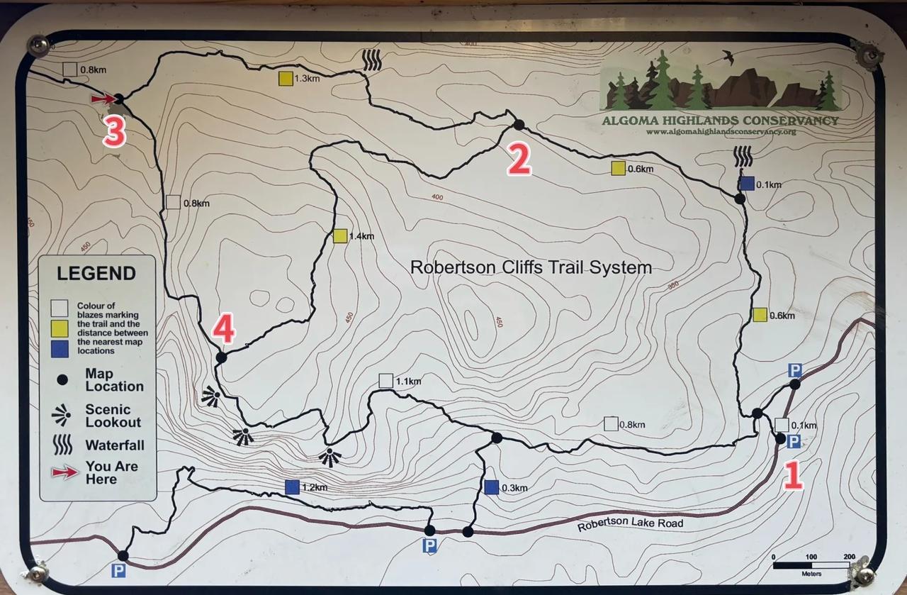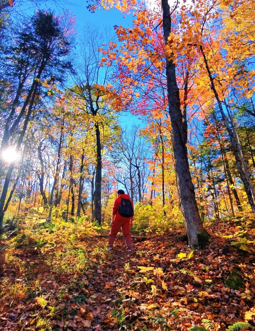 Sault Ste. Marie四天三晚摆烂赏枫(上) 感恩节长周末,目的地Sault Ste. Marie,爬山➕坐小火车➕看枫叶🍁 此次旅行主打一个摆烂 松弛 10.11 多伦多出发,约8小时车程,一路美景。图2️⃣ 10.12 上午市区景点,下午探索两个公园。图3️⃣ 🍳8:30 The Breakfast Pig吃早餐 分量实在。点了招牌早餐。图4️⃣ ⏰40分钟 📒停车位不多 建议8:30前到 🚶9:30 Sault Ste. Marie Boardwalk漫步 河畔栈道,平坦好走,听风声水声。图5️⃣ ⏰20-40分钟 📒边上的mall停车方便;河边风大需穿外套 🚢Sault Ste. Marie Canal和历史博物馆就在附近,可以看船闸运作和了解当地历史文化。以前去过,这次摆烂跳过了 ✈️10:30-11:00 Bushplane Heritage Centre 水上飞机博物馆,展馆不大但把我队友迷成个制杖[吐舌]有些飞机还可以去驾驶室参观。图6️⃣、7️⃣ ⏰1小时 📒边上有个1km的沿岸步道,可打发时间 🍔午饭:麦记…大富翁收集中 🥾 14:00-13:00 Kinsmen Park 🅿️图8️⃣的停车场边有野餐桌和秋千,可以边欣赏湖水边享用美食 ↙️西南边的步道入口通往一个小瀑布,可绕湖一周。疏影横斜湖面如镜。图9️⃣、🔟 ↗️东北边的步道入口通向crystal falls,需原路折返。水声潺潺十分治愈。图1️⃣1️⃣ ⏰1.5km/60分钟 📒公园步道很多,有些是冬季Snow shoes和ski的超长步道,不要走错 ⛰️15:30-19:00 Robertson Lake Cliff Trail 30分钟车程抵达今日行程亮点。Trail head的停车场(相对)较大,路线选择多。我们走了最长的Loop,图1️⃣2️⃣1-2-3-4-1…其实是迷路了[捂脸] ⚠️地图上那两个小瀑布啥也不是[笑哭](图1️⃣3️⃣,1️⃣4️⃣) 山顶俯瞰枫林树海的美景都集中在4附近,山路崎岖但绝对值得(封面➕1️⃣5️⃣-1️⃣8️⃣) ⏰7km/3.5hr 📒带足水;穿防滑登山鞋;崖边无防护,拍照需谨慎;日落前下山 ‼️时刻谨记‼️脚滑的人先享受自由落体 加拿大生活 徒步踏秋地图 追着秋天去旅行 枫叶 徒步