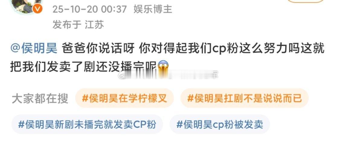 tg. 《入青云》破万,侯明昊在自己超话表白唯粉,被网友审判了,cpf觉得剧还没播完就被发 卖很不满。。。