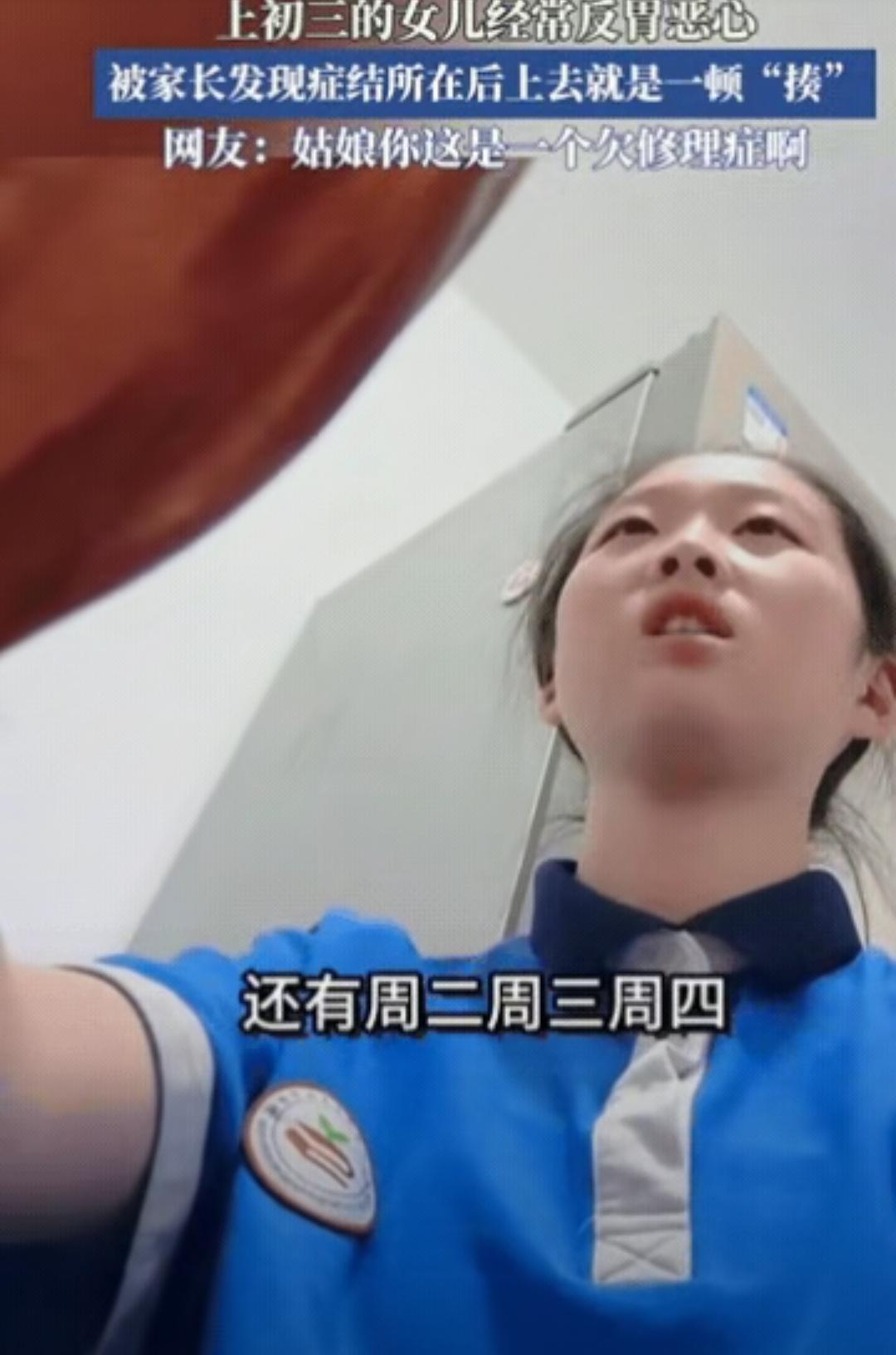 这就是欠揍!近日,北京一初三女生经常反胃恶心,爸爸不在意,妈妈还以为她病了,训斥爸爸不够关心女儿,接着,妈妈贴心询问女儿症状,还准备带女儿看医生,没想到,听完女儿解释之后,妈妈被气得不轻,直接上去就是一顿“揍”,网友:姑娘你这是一个欠修理症啊! 那天是个周末,李女士(化名)一家人难得坐在一起吃晚饭。 桌上摆着她女儿最爱吃的菜。 可女儿却一反常态,连筷子都没怎么动。 李女士一边夹菜一边注意到了女儿的神情,问道:“怎么了?胃口不好吗?” 女儿抿了抿嘴,小声说:“有点恶心,这几天总是想吐。” 坐在一旁的丈夫笑着劝道:“可能是最近吃多了油腻的东西,过两天就好了,别大惊小怪的。” 李女士眉头一皱,筷子轻轻一放,语气有些不悦:“你就知道这么说。孩子都这样了,你还不带她去医院看看?万一是肠胃炎怎么办?” 餐桌气氛一下子凝固了,空气中弥漫着一股尴尬的火药味。 李女士越看越心疼,她轻轻摸了摸女儿的额头,心里升起一阵隐隐的不安。 李女士越听越觉得不对劲,她放下筷子,语气温和地问:“那你跟妈妈说说,最近除了恶心,还哪里不舒服?是不是吃坏肚子了?” 女儿摇摇头,想了想,说:“也不是天天都这样。” 李女士赶紧问:“那什么时候会恶心?” 女孩认真地数着手指说:“我周一到周四早上都会觉得反胃,吃早饭的时候特别难受。周五上午也有点不舒服,不过下午就好了。周六一点事都没有,我还挺开心的。周日白天也没事,但一到晚上就开始难受……” 李女士皱起眉头,细细回味她这几句话,心里突然有了数。她盯着女儿看了几秒,语气慢慢变了:“那要是周末不休息,去上补习班呢?” 女儿没多想,脱口而出:“那肯定又恶心啊。” 话刚说完,李女士“啪”地一声把筷子拍在桌上,气得脸都红了。 她一边站起来,一边指着女儿:“你不是病,是不想上学!” 但李女士这时候已经控制不住情绪,伸手就想要揍她!女儿也笑嘻嘻的赶紧跑。
