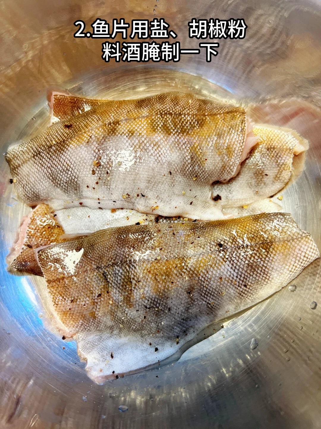 2、鱼片用盐、胡椒粉、料酒腌制一下