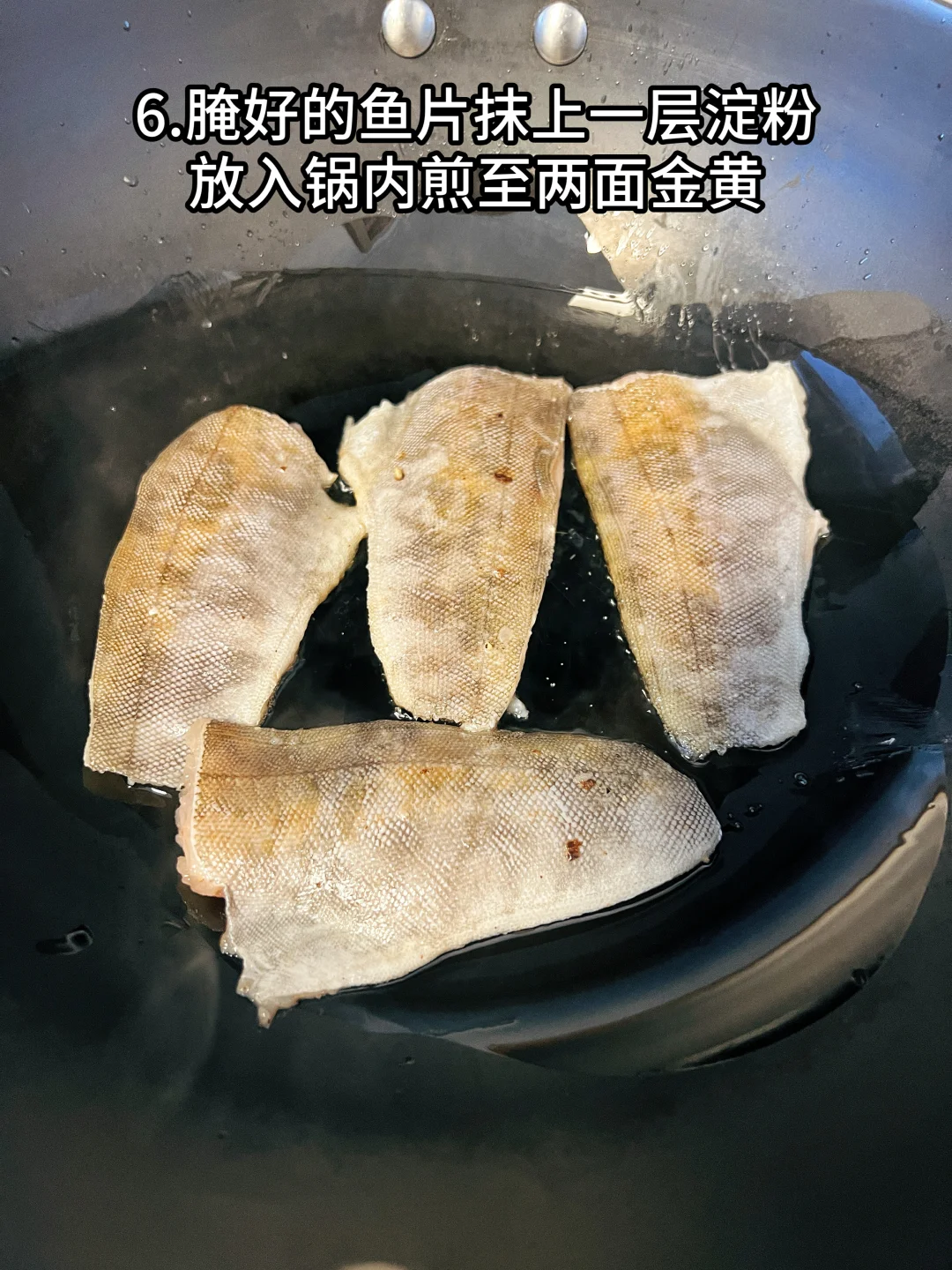 6、腌好的鱼片抹上一层淀粉放入锅内煎至两面金黄